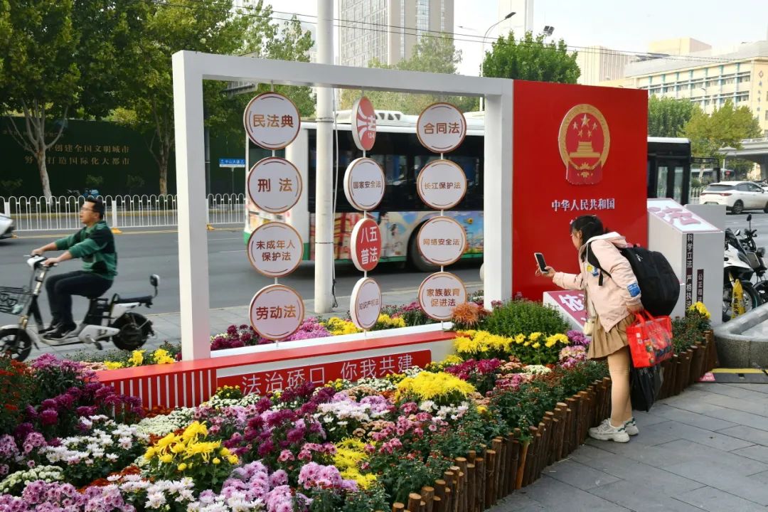 在硚口区司法局展位,菊花的簇拥下,法治标志熠熠生辉,共同编织成一幅法制与美景交融、庄严与浪漫共生的绚丽画卷。