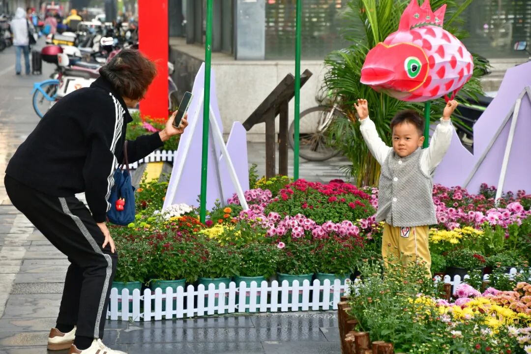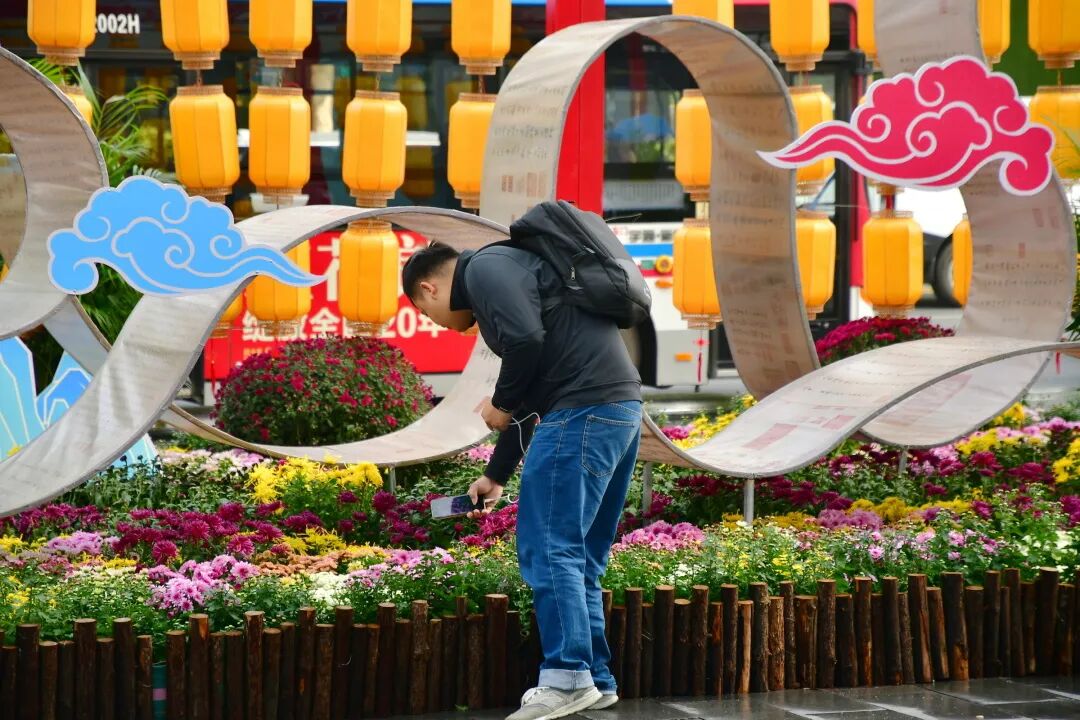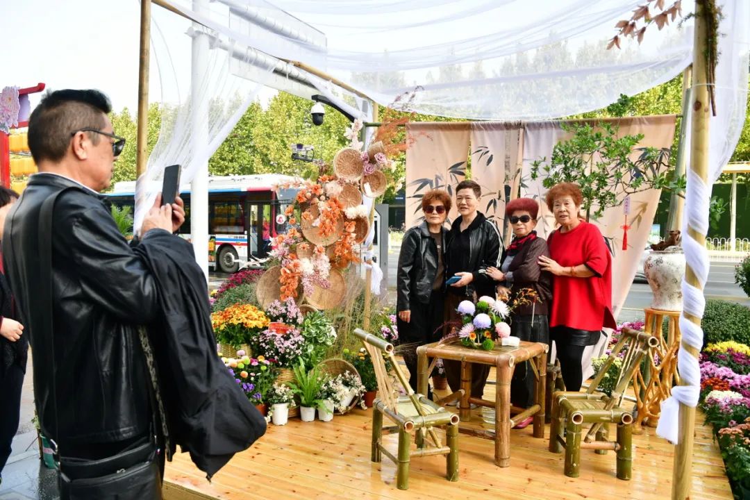 花丛中,轻纱幔帐、竹影婆娑,诗词歌赋元素的中式浪漫,与菊花相映成趣,吸引了无数行人驻足观赏、拍照留念。