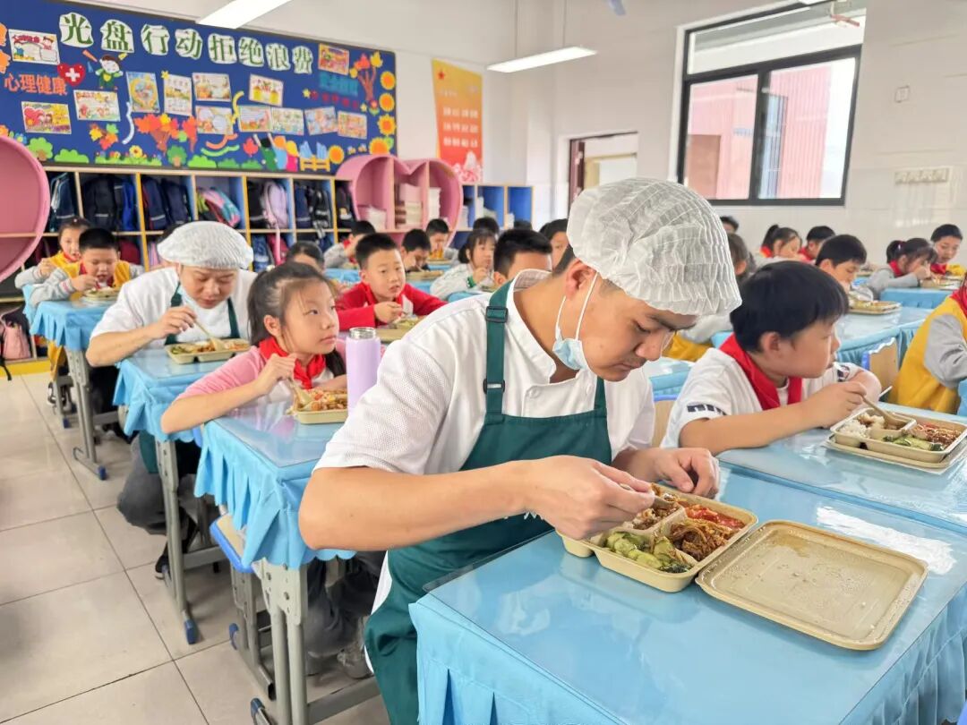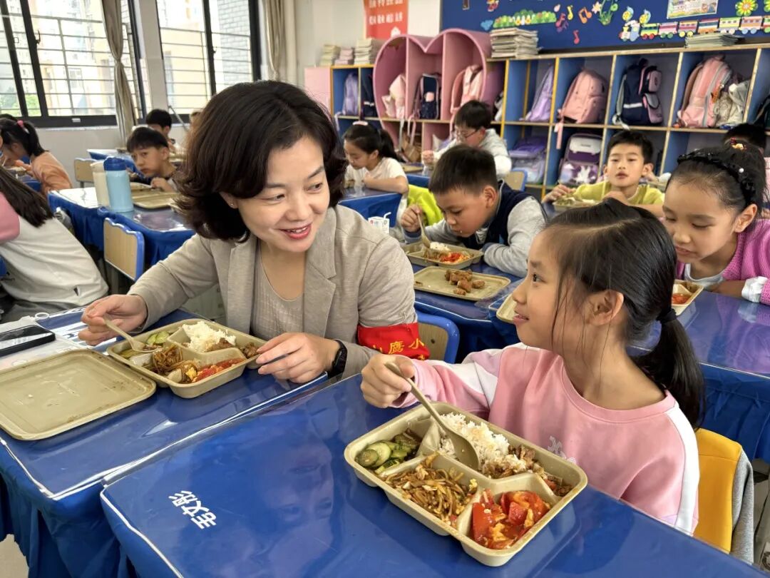 为了让学生吃得满意,学校认真落实“书记校长陪餐”“食堂管理干部陪餐”“学生家长陪餐”和“食堂大厨陪餐”。通过和学生一起取餐、进餐、餐后整理餐盒,干部和家长参与进餐全过程,了解学生的口味和需求。“今天的菜好吃吗?”“好吃!但是这道菜里能多加点醋就更好了!”孩子指着那份清炒藕丁说道,“对,还有昨天的鱼,能做成酸甜味吗?我们都喜欢!”陪餐干部将真实反馈带给食堂大厨,让孩子们吃出自己做主的好味道。“校长,为什么好久没有做‘花饭’了?”这道食品工序复杂,食堂出餐需要更长时间,但是孩子们心心念念,为满足孩子的需要,学校食堂每周五精调菜谱,师傅提前半小时到岗准备,把这道菜“还”给孩子们。三年级(2)班程梓馨妈妈和孩子一起进餐后,欣慰地对班主任说:“孩子在学校进餐,我是一百个放心。”