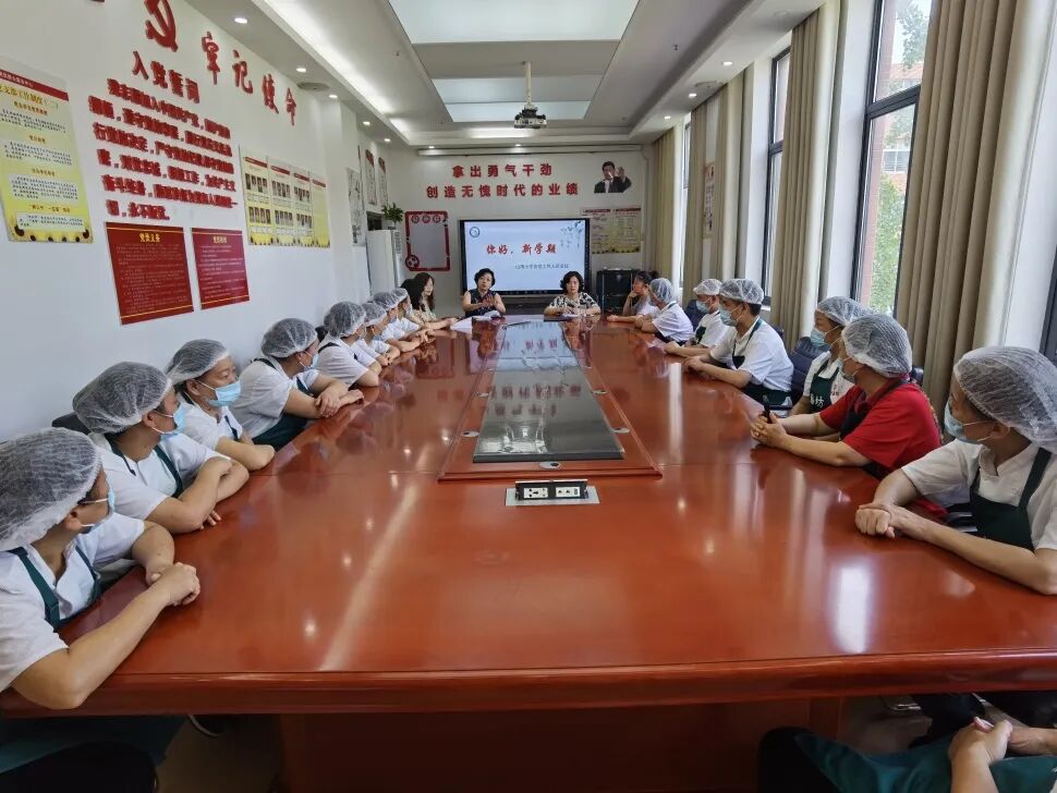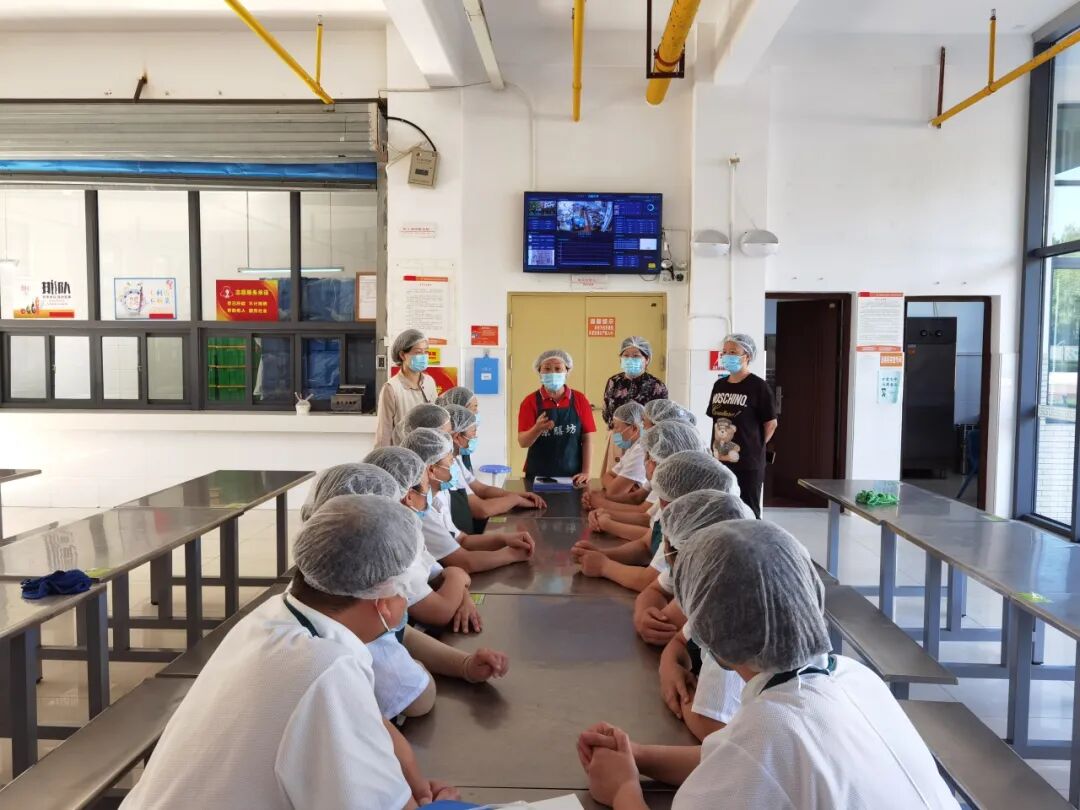 每天定时召开学校食堂“晨会”和“夕会”:工作人员在进入工作间前,查看健康状况,检查戴帽不漏发、口罩不漏鼻、布鞋不湿脚等“三不准”情况,通过“夕会”总结反馈当天严把“五关”(采买准入关、生产操作关、成品装盒关、餐具消毒关、个人卫生关)情况,确保从食材采购到送上餐桌的全过程都受到严格的监督和管理,守护校园餐的安全健康。