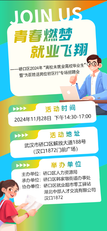 为深入贯彻党中央、国务院关于促进高校毕业生等青年就业工作决策部署,落实全国高校毕业生等青年就业创业工作,强化就业服务,畅通求职招聘渠道,提高对接匹配效率,根据实际,硚口区人力资源局联合相关单位拟举办硚口区2024年“离校未就业高校毕业生”暨“为百姓送岗位社区行”专场招聘会。