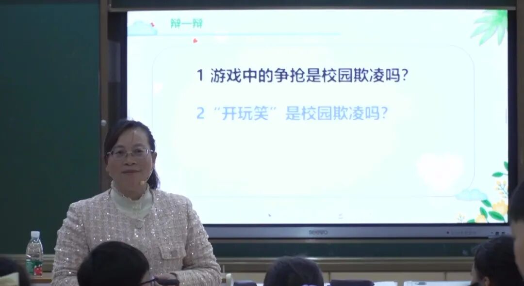班会课由湖北省第三届荆楚教育名家培养对象,武汉市功勋班主任,华师附属千禧城小学副校长冯莉执教。课堂上,冯校长通过动画片、情景剧、微讨论和小讲堂等多种形式让同学们了解校园欺凌的特点和类型,并创设情境让学生学会应对欺凌、逃离现场、大声求助、勇敢表达,对校园欺凌说“不”。接着,冯校长以赛促学,普及和宣传了诺如病毒的相关知识,提高师生传染病防护能力。
