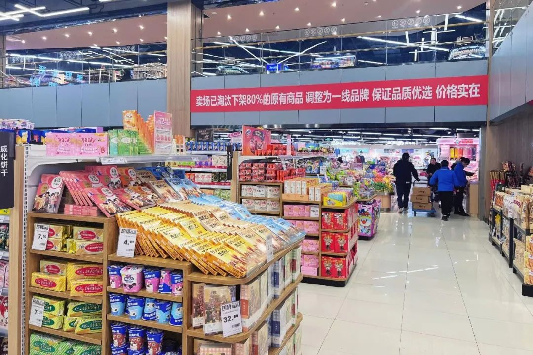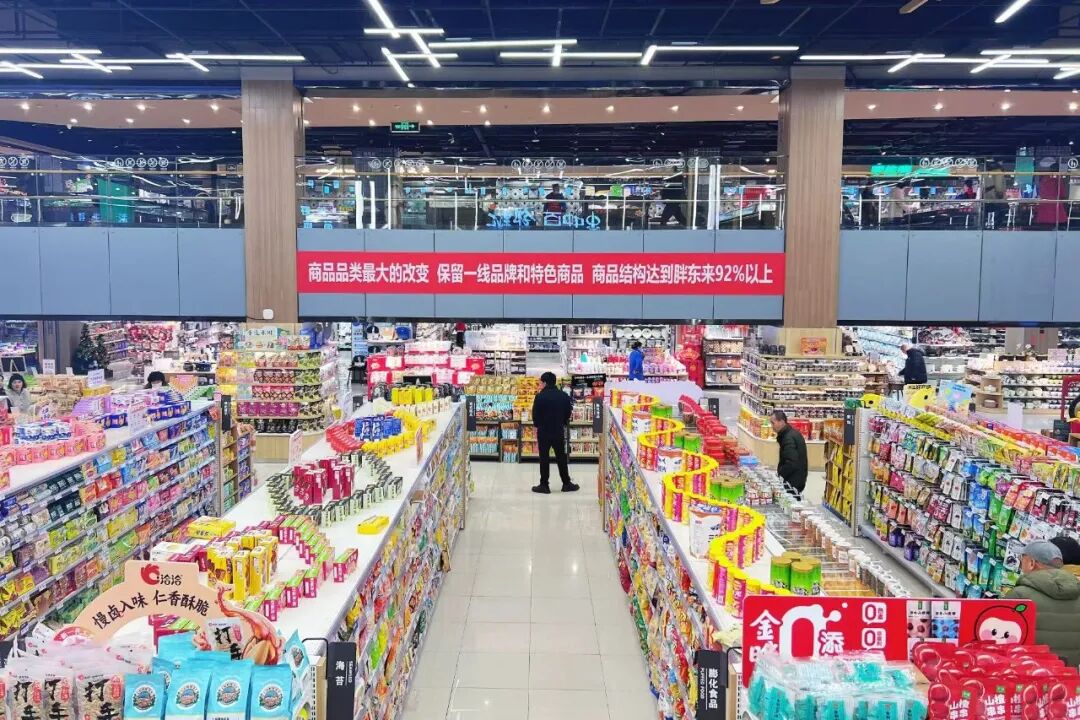 从进门就感受到了调改的魅力,新与旧的碰撞肉眼可见。据超市人员介绍,在商品呈现上,门店紧跟市场趋势,淘汰老商品7659个,对标引进10419个,商品淘汰率68%;保留一线品牌和特色商品,增加趋势性、潮流性、网红类商品,商品结构达到胖东来92%以上。