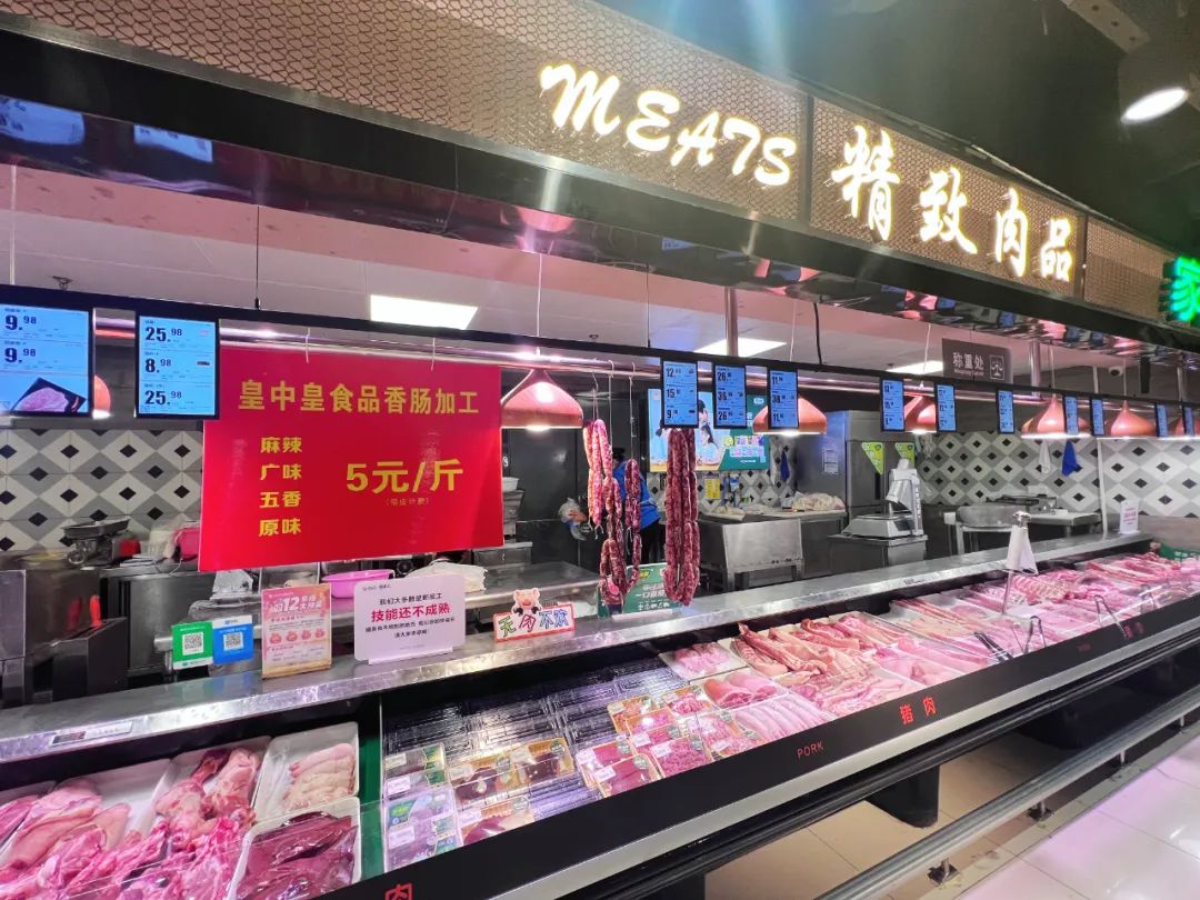 果蔬区一旁的海鲜区品类不算多,但武汉人爱的海产这儿都有,水池清澈干净,看着使人舒服。还无意发现了超市不多见的虹鳟和黄鳟,过年家里想讨个好彩头,鱼的选择上终于不再是财鱼、鲟鱼一类了。隔壁的香肠柜台前被围得水泄不通,旁边已经挂起的肉肠,红彤彤一片,让超市里飘满了肉香,灌满了年味。皇中皇食品香肠加工,5块钱一斤,各种口味任选,简直绝绝子。