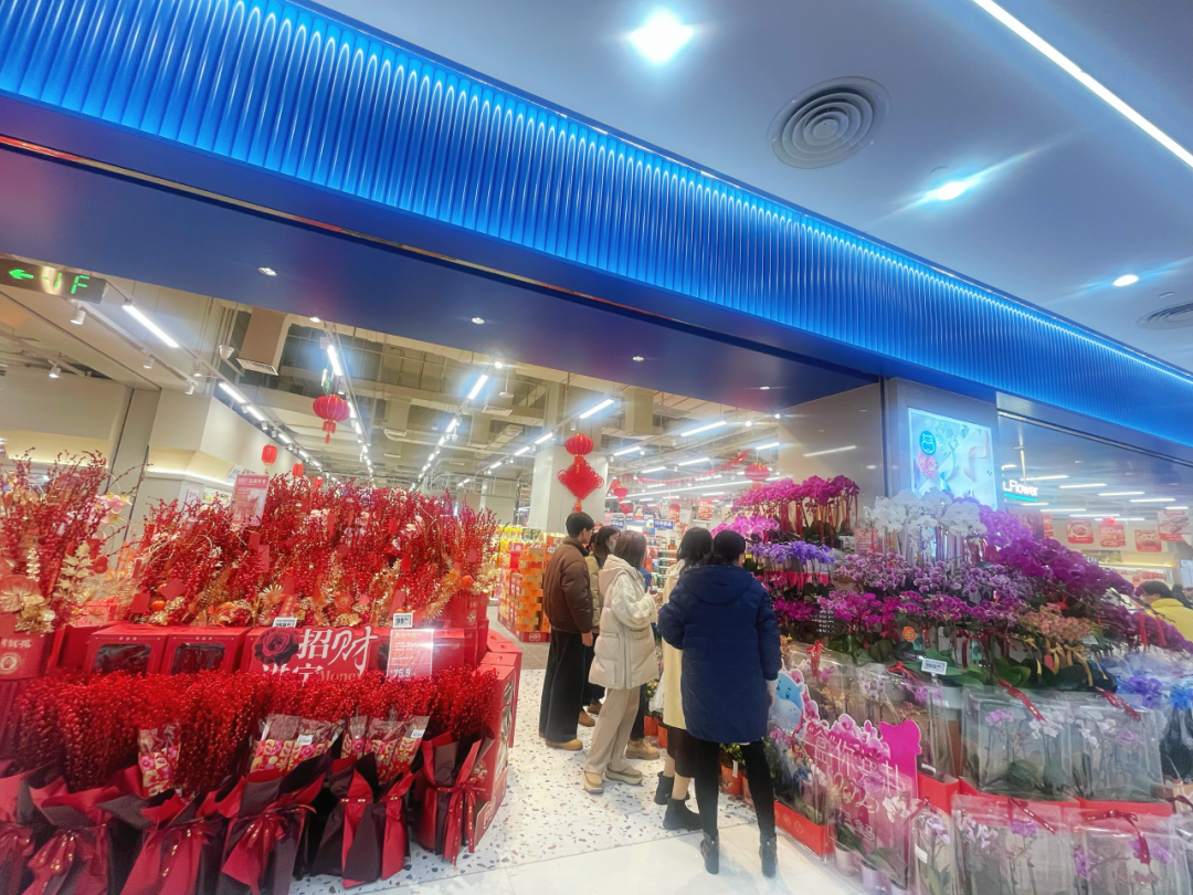记者注意到,门店入口醒目位置陈列了多款年节礼盒,包括干货、山茶油、坚果礼盒、腊肉火腿、休闲零食等等,礼盒品种丰富,可以满足不同人群的赠礼需求;红颜草莓、爱媛橙、车厘子等水果礼盒也已悉数登场;在鲜花区域,银柳、冬青、朱顶红、蝴蝶兰等年宵花争奇斗艳,年节氛围十足。