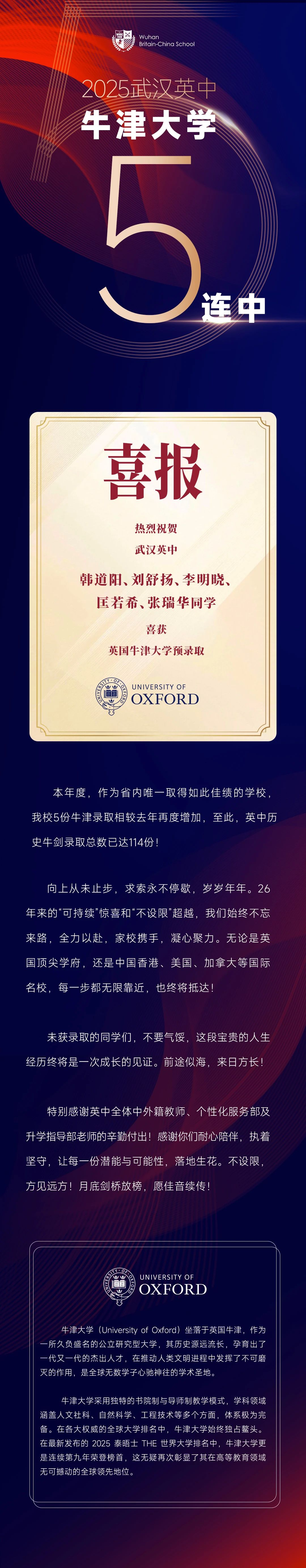建校以来,武汉英中出口成果斐然,高中毕业生中超八成获世界超一流大学录取,在以英国牛剑为代表的顶尖高校录取、加拿大前四高校录取、中国香港地区前三录取均位居全国三甲,美本TOP20为代表的顶尖录取稳居全国前十!