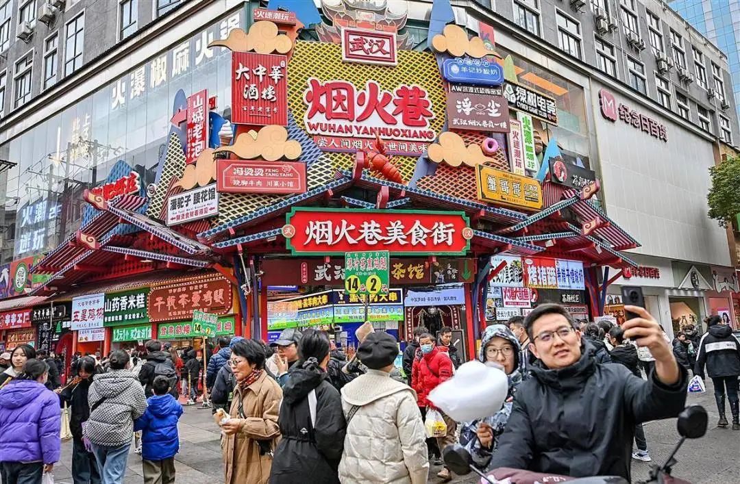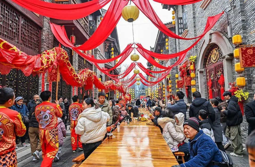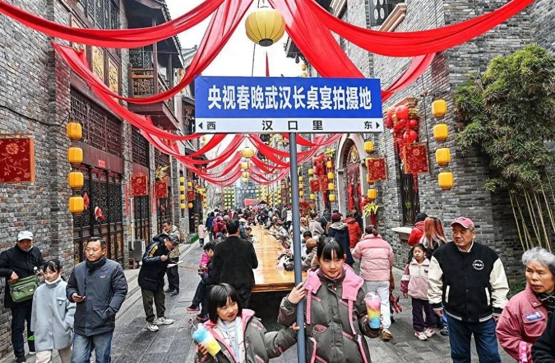 2月12日正月十五元宵节,武汉汉口里“央视春晚武汉长桌宴拍摄地”人潮涌动,市民游客纷纷在长桌上用餐,沉浸式体验“春晚同款”地标,解锁英雄之城的千面风华。