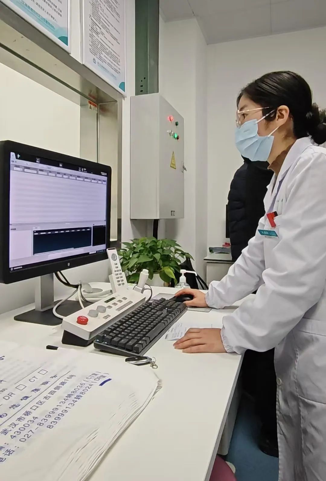 推想医疗(武汉)专家指导韩家墩街社区卫生服务中心放射科放射主管技师姚燕秋(右)使用AI医生系统