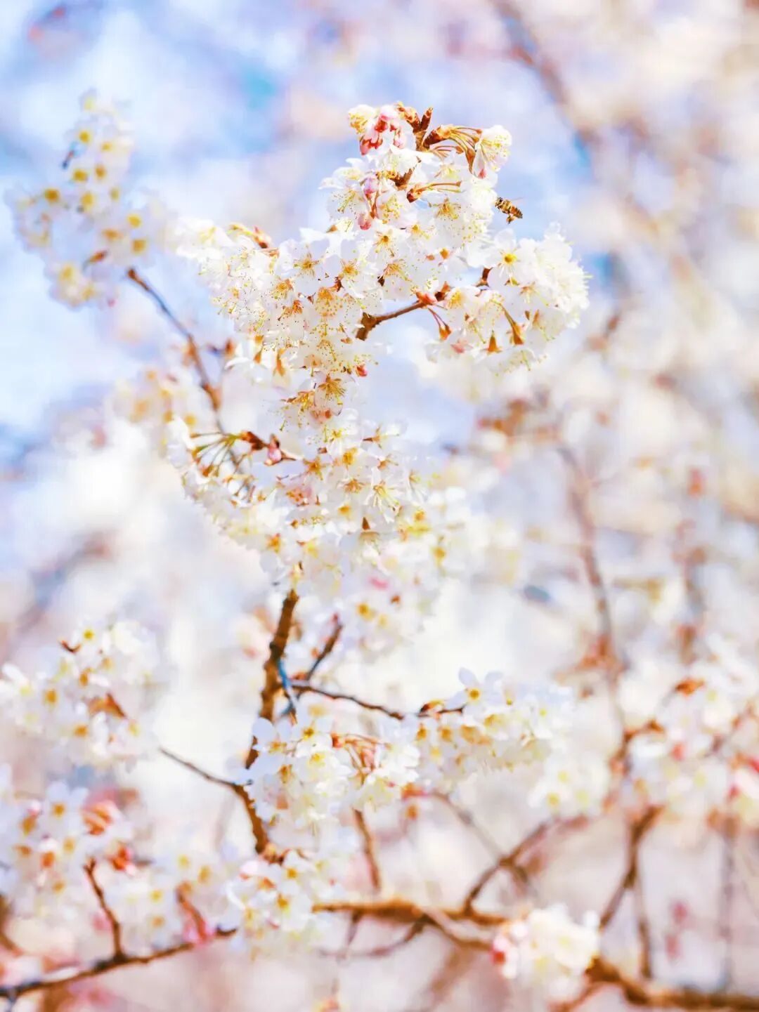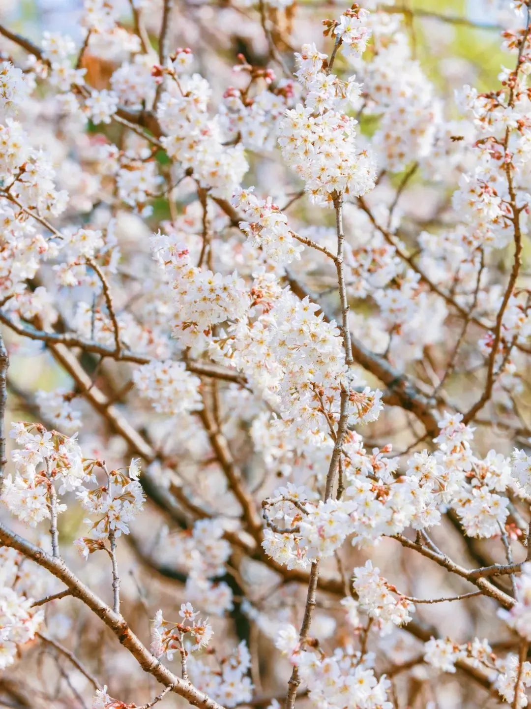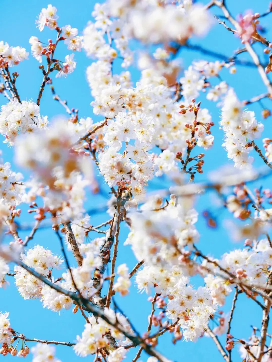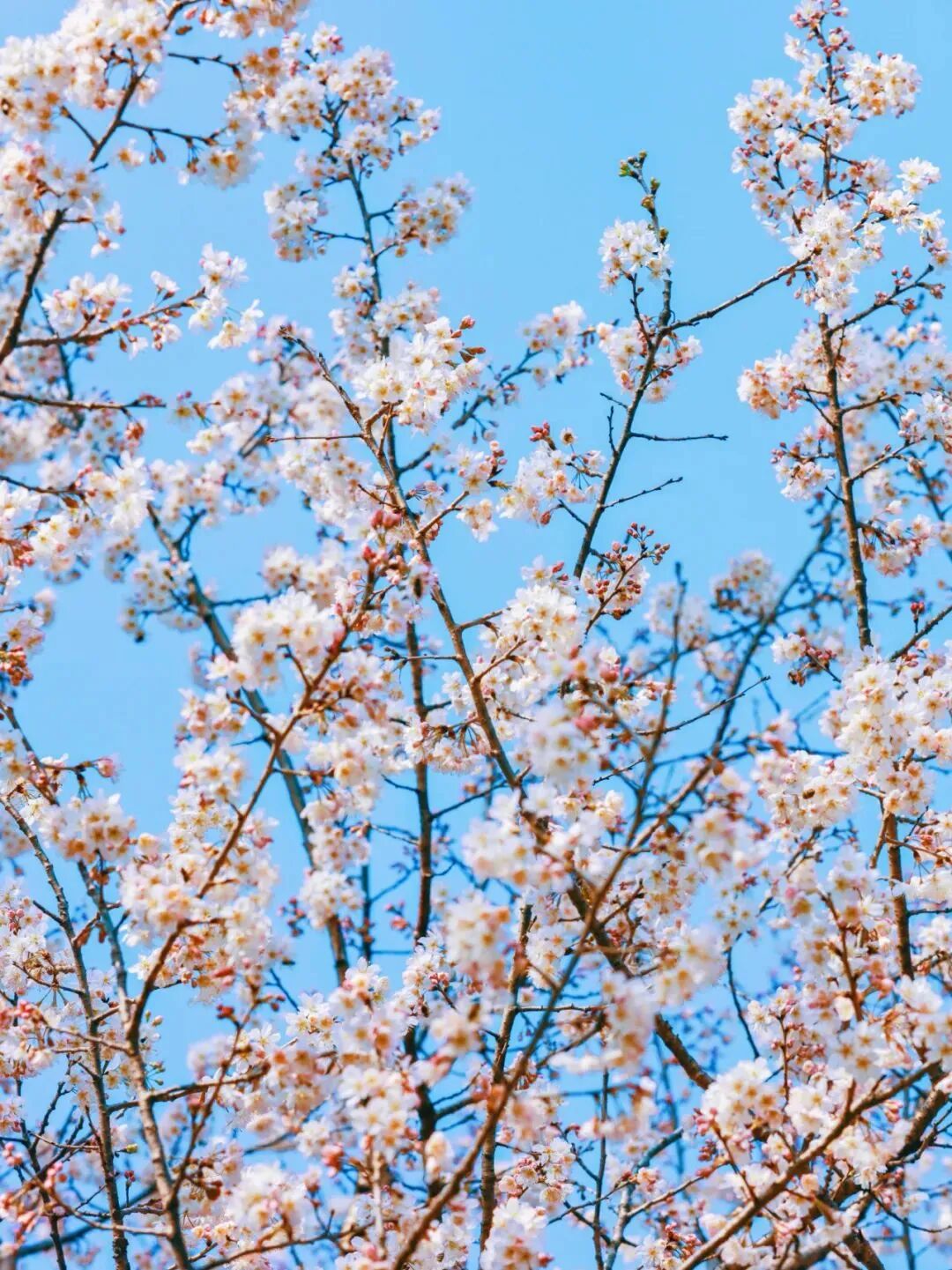 3月上旬,飞寒樱以深粉浪潮点燃赏樱热潮;中旬染井吉野初绽,淡雅花云与蓝天相映;