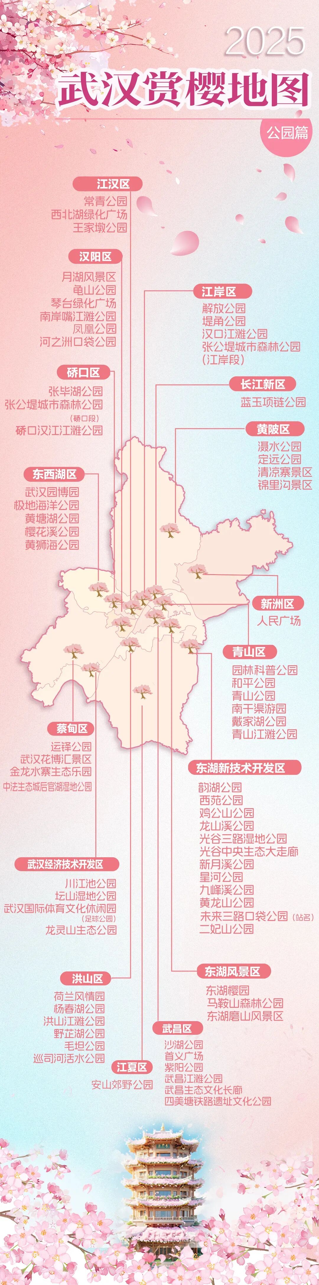 按照樱花的花期武汉每年共有早、中、晚樱三波樱花眼下各大公园的早樱迎来盛花期