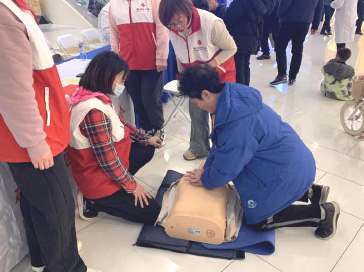 活动现场,区红十字会的应急救护展位吸引了众多市民驻足观看。区红十字会应急救护志愿服务队现场演示了心肺复苏、海姆立克急救法和AED(自动体外除颤器)的使用方法,胸外按压、开放气道、人工呼吸……每一个动作都准确到位。