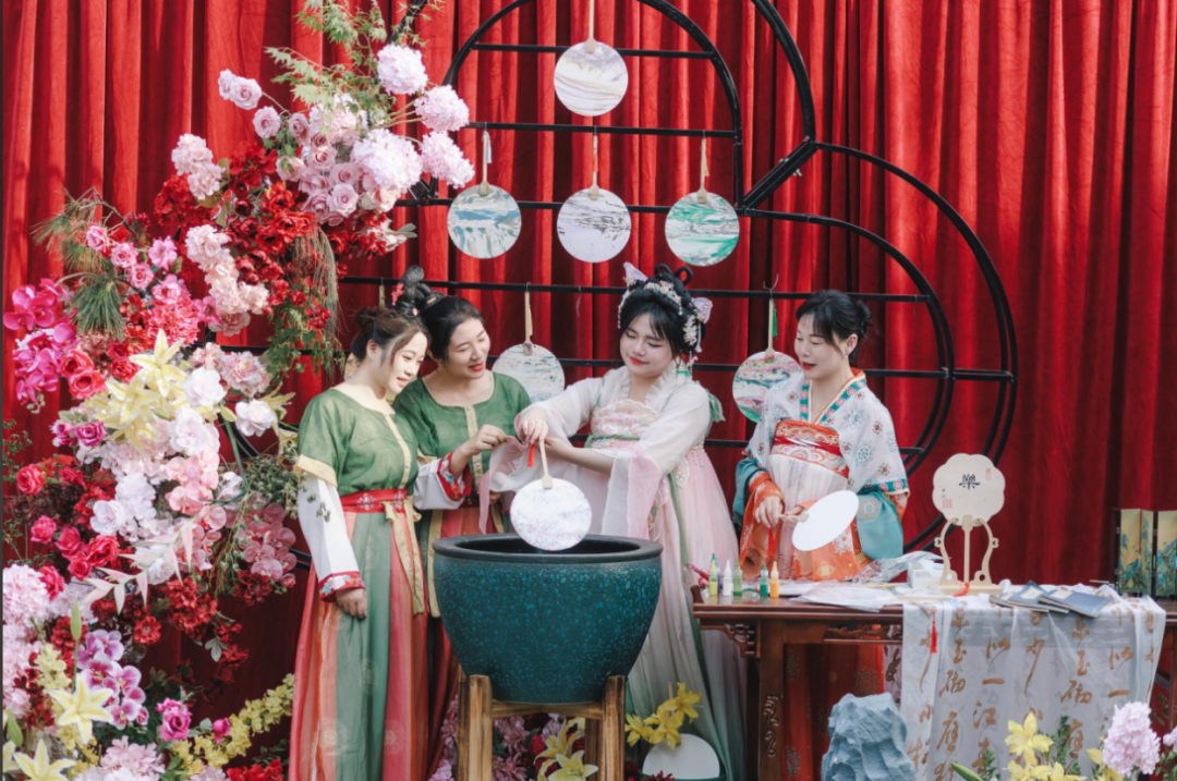“汉口里花朝节”北区分会场——【如苑】将化身花朝秘境,你可以身着华美汉服,踏入【如苑】中式水系庭院;也可以携挚友围炉煮茶品花香,执弓投壶展英姿,染制漆扇寄相思。