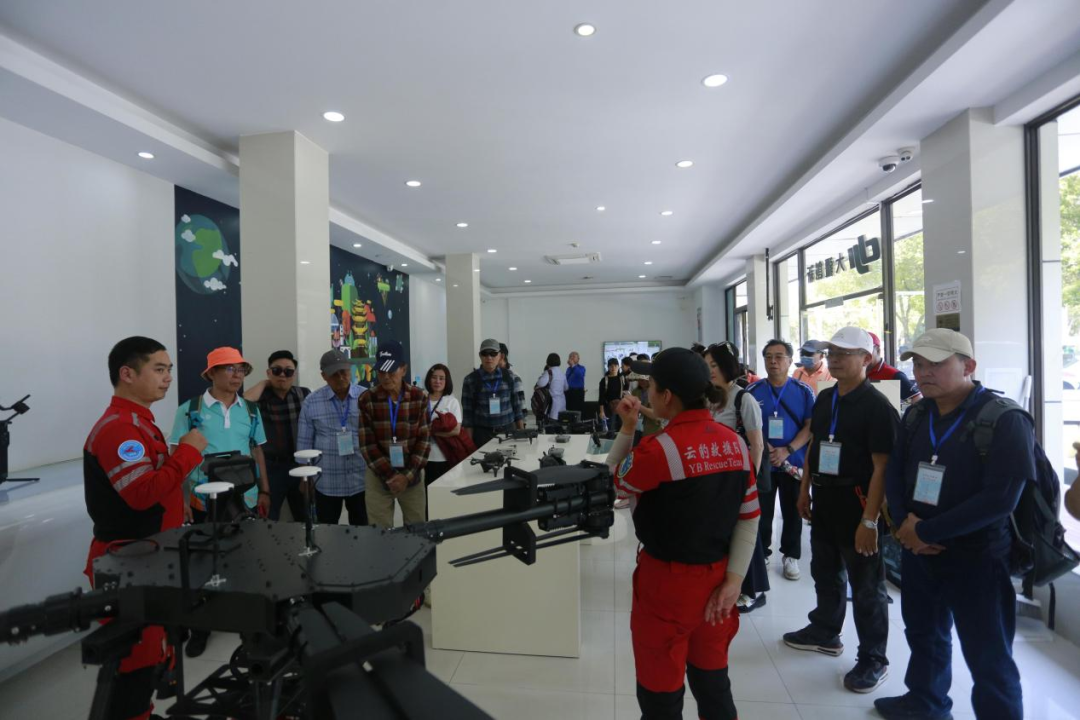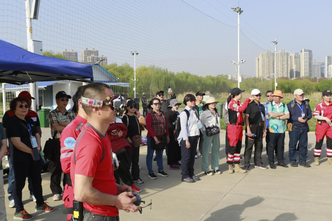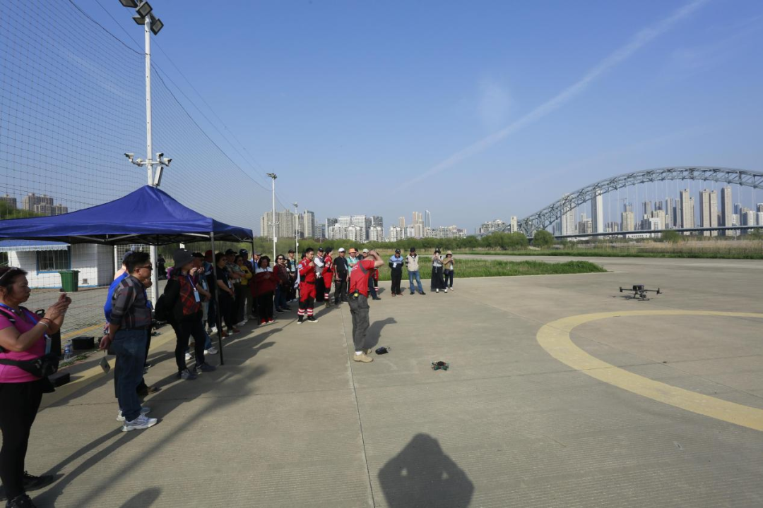 下午,代表团来到硚口汉江湾体育公园,阳春三月草长莺飞,汉江湾公园春意正浓,大家惊叹于市中心有这样大体量的“城市绿肺”,健身跑道、惬意绿萌、江滩步道一应俱全,为市民提供了放松身心、休闲健身的好去处。大家打卡汉江上最美大桥——古田桥,以清新的淡蓝色普鲁士凯旋门造型为背景拍照留念;在汉江湾观景平台欣赏汉江流经硚口第一弯。汉江湾体育公园优美的自然环境和完备的体育场馆设施,让来访的台湾同胞真实体验到硚口滨江生态城区和健康体育强区的发展、活力和因水而生的灵气。在汉江湾体育公园,参访台胞还饶有兴趣地参观了武汉云豹救援队队部和大疆无人机店。随后,大家来到汉江湾航空飞行营地观看了云豹救援队模拟演练。只见救援队的多功能无人机将绳索和救生设备精准投放至“落水者”身边,这种高效快捷安全的救援模式,赢得了台胞们的连连称赞。云豹救援队还为台湾嘉宾们进行了喷火无人机和穿越机的表演。