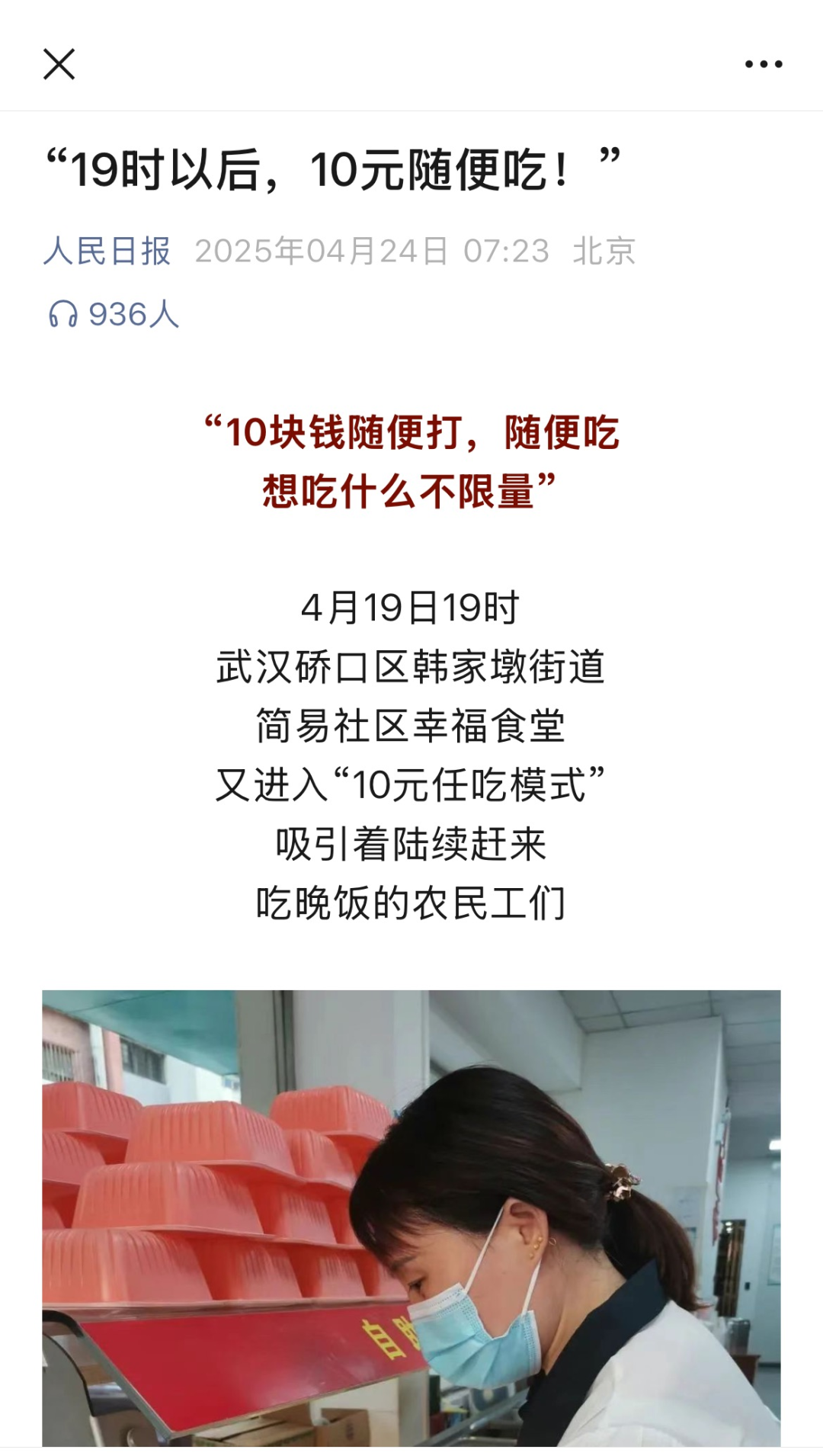 继“长江日报”报道了硚口区韩家墩街道简易社区幸福食堂“10元任吃模式”,引来了广泛关注后,不少网友评论:求全国推广!24日,人民日报再次聚焦简易社区幸福食堂!让硚口这个社区的幸福食堂火速出圈。