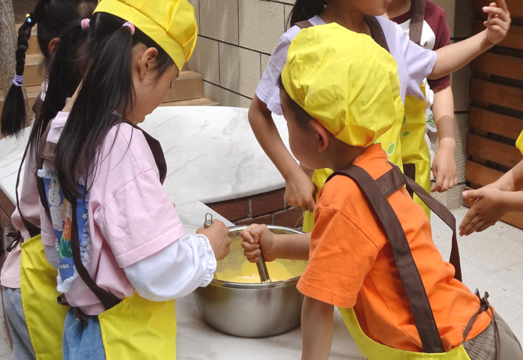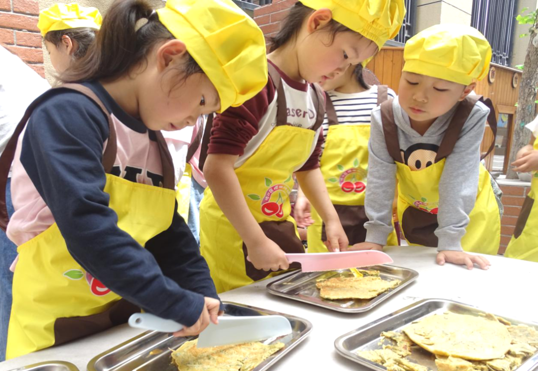 “老师,瞧我这香椿饼,多像太阳啊!快来尝尝吧!”孩子们穿着小围裙,在“小厨房”里忙个不停。