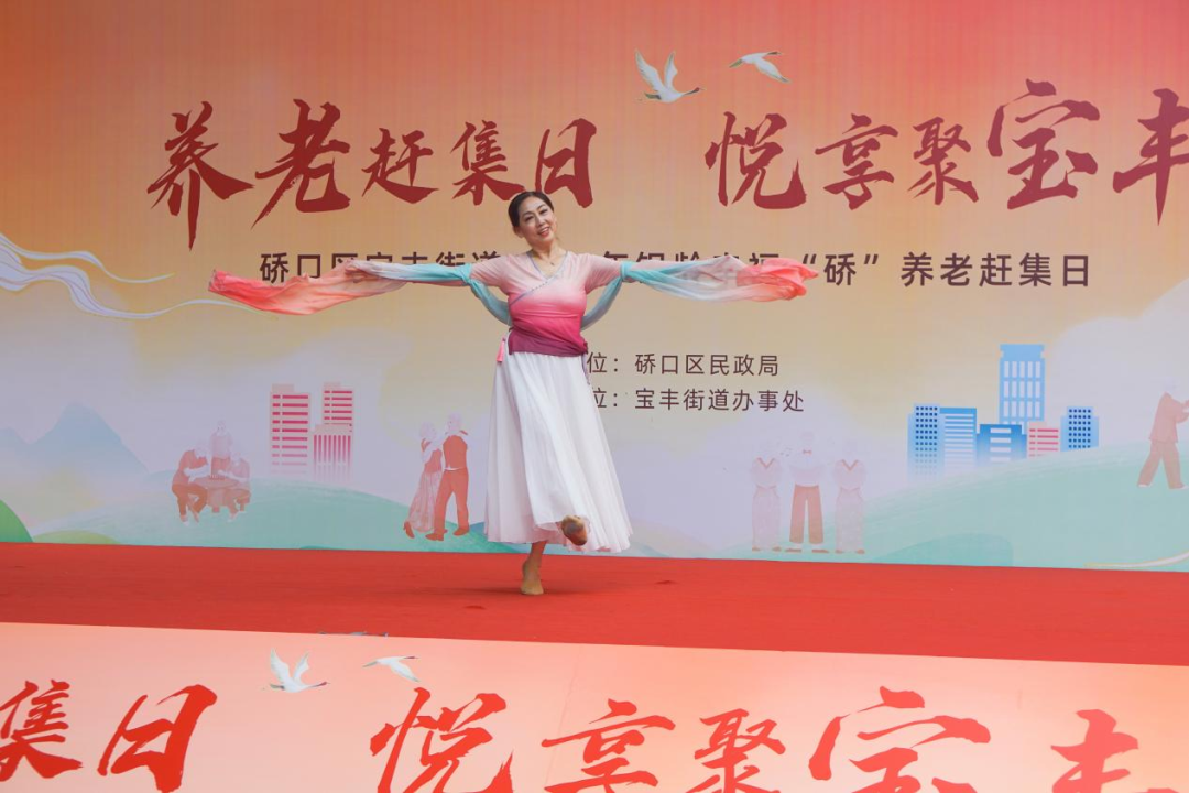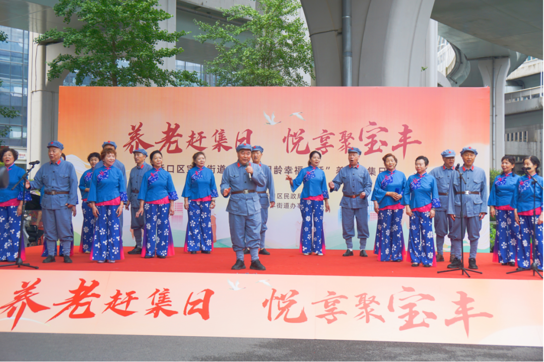 歌舞表演现场精彩纷呈,老年人自我创编,踊跃登台,葛洲坝社区的舞龙《中国龙》气势磅礴,3506社区的独舞《五星红旗》婀娜多姿,利北社区的京剧选段《忠于人民忠于党》韵味十足,站邻社区的舞蹈《苹果香》深情动人,公路社区的时装秀《庸情》优雅时尚,15个老年人合唱的歌曲《爱永在》抒发了当代老年人“人老志坚、老有所为”的信念和担当,展现了永不停歇、奋勇前进的精气神。