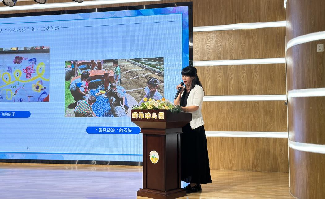 在专题分享中,汉江湾幼儿园陈芳园长围绕《以“乐”启心 以“创”赋能》,分享了园所理念品质——“乐创”教育的探究历程。她介绍道,园所深度挖掘硚口院士文化内涵,将其融入乐创文化建设,构建起以创新思维培养为核心的园本文化体系。同时,通过整合开放多元的教育环境,将抽象的教育理念转化为幼儿可感知、可参与、可实践的生动场景。