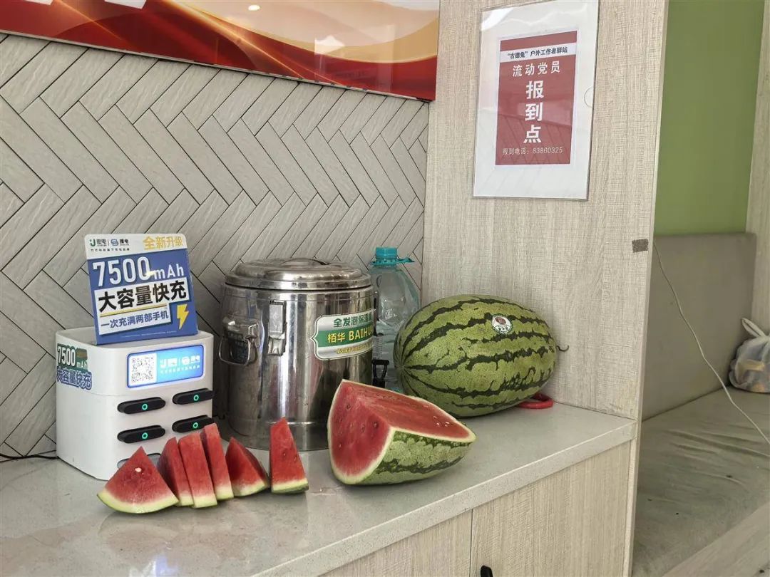 “我们这儿每天接待70到80人,主要是外卖配送员、环卫工、园林工等户外岗位的工友。”驿站管理员向莹介绍,“每年一到这个时候,我们都会准备好藿香正气水和西瓜,让大家解暑消渴。”