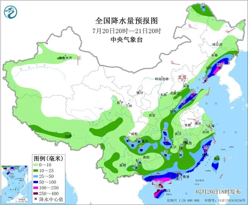 7月20日20时至21日20时,广东中南部、香港、澳门、海南岛、广西南部和西部、福建东部、浙江东南部、江西西部、湖南西部和南部、湖北西部、台湾岛中南部以及黑龙江西北部、吉林东南部、辽宁东部和南部、山东中北部、河南东北部、四川盆地南部、重庆南部、贵州北部和西南部等地有大到暴雨,其中,广东西南部、海南岛中北部、广西东南部沿海、吉林东南部、辽宁东南部、山东北部、湖南西北部等地的部分地区有大暴雨,广东雷州半岛、海南岛北部等地局地有特大暴雨。