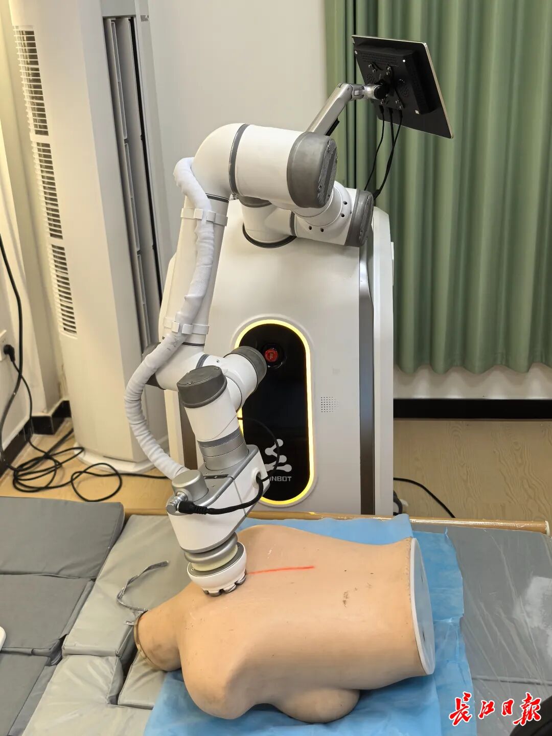 现场还摆放着一台智能按摩机器人,工作人员启动后,机械臂灵活地按照设置开始为模型进行按摩,中心负责人介绍,使用不同按摩头,可分别完成中医灼灸、电磁波按摩等多类按摩服务,“老人按照屏幕提示就能操作,也可以让工作人员来协助服务,在家门口就能享受专业级按摩”。