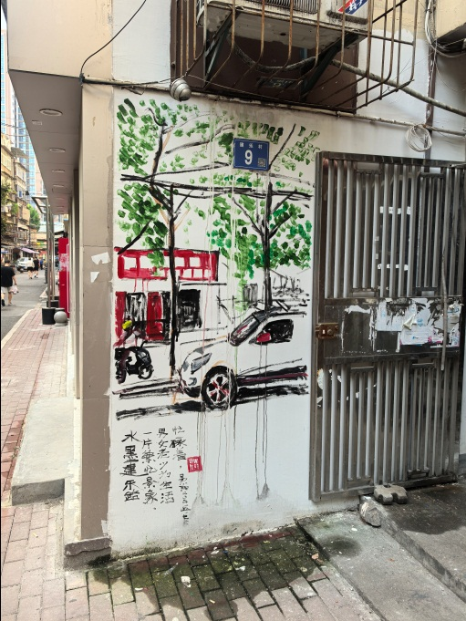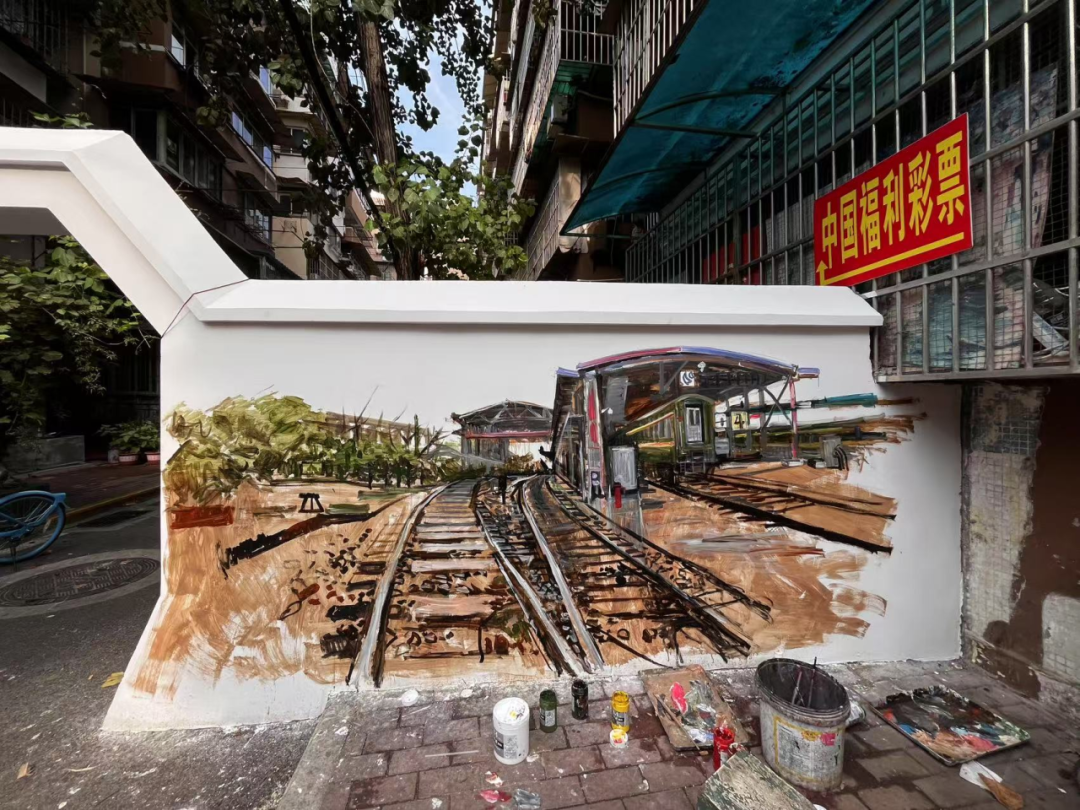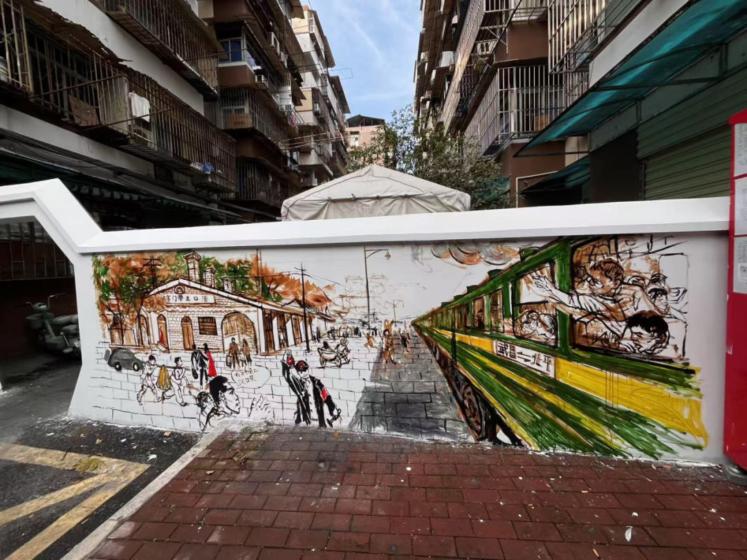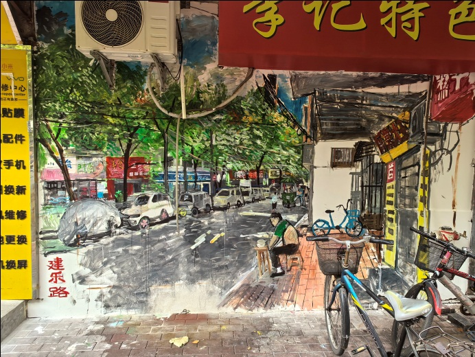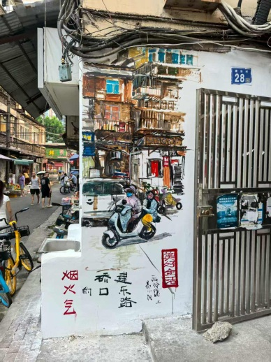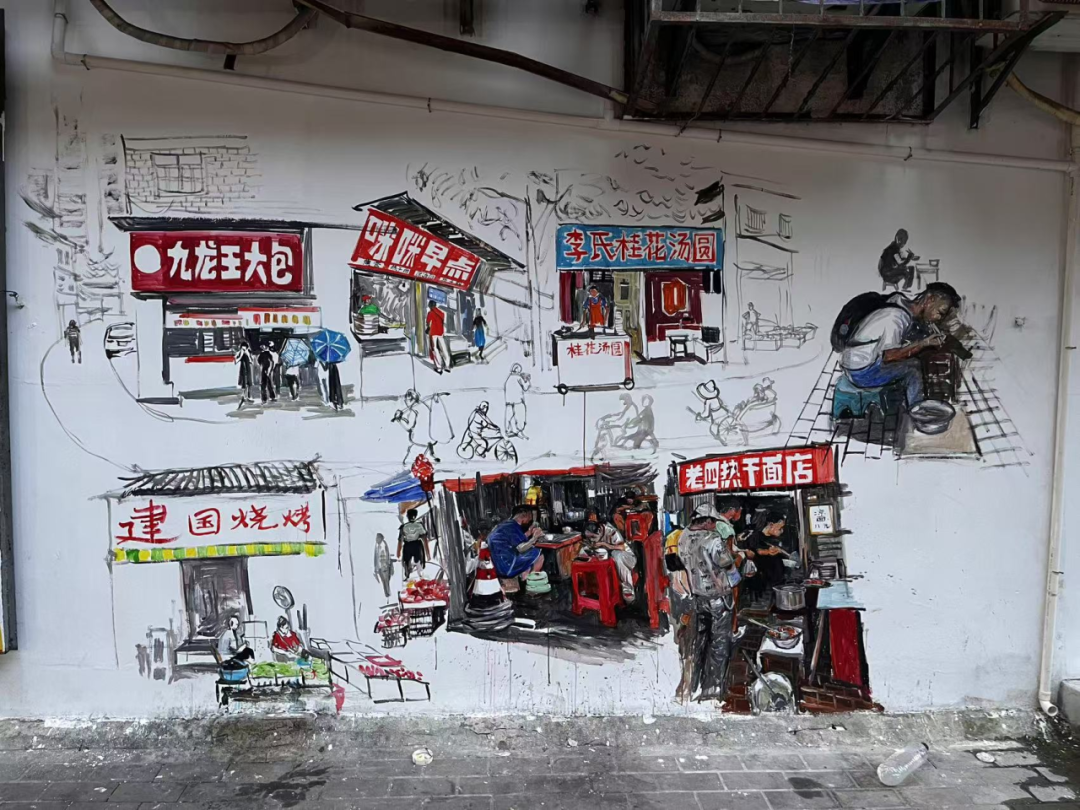 细碎的生活场景则藏在小块面的墙绘里:老人们在早点摊前过早的闲适,电动车驶过的清脆铃音混着车轮碾过路面的声响,带着市井特有的喧闹劲儿,傍晚时分悠哉归家的大叔……这些不起眼的日常,被画笔悄悄记下,成了时代变迁里最动人的注脚。