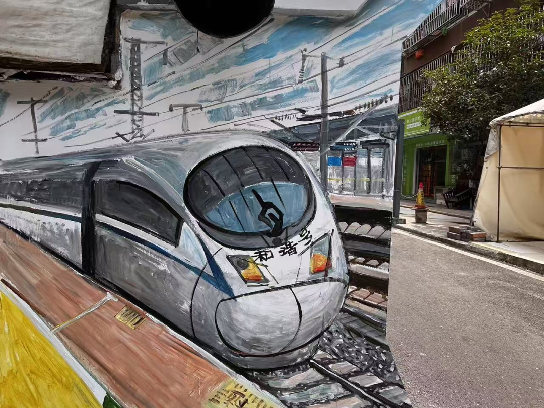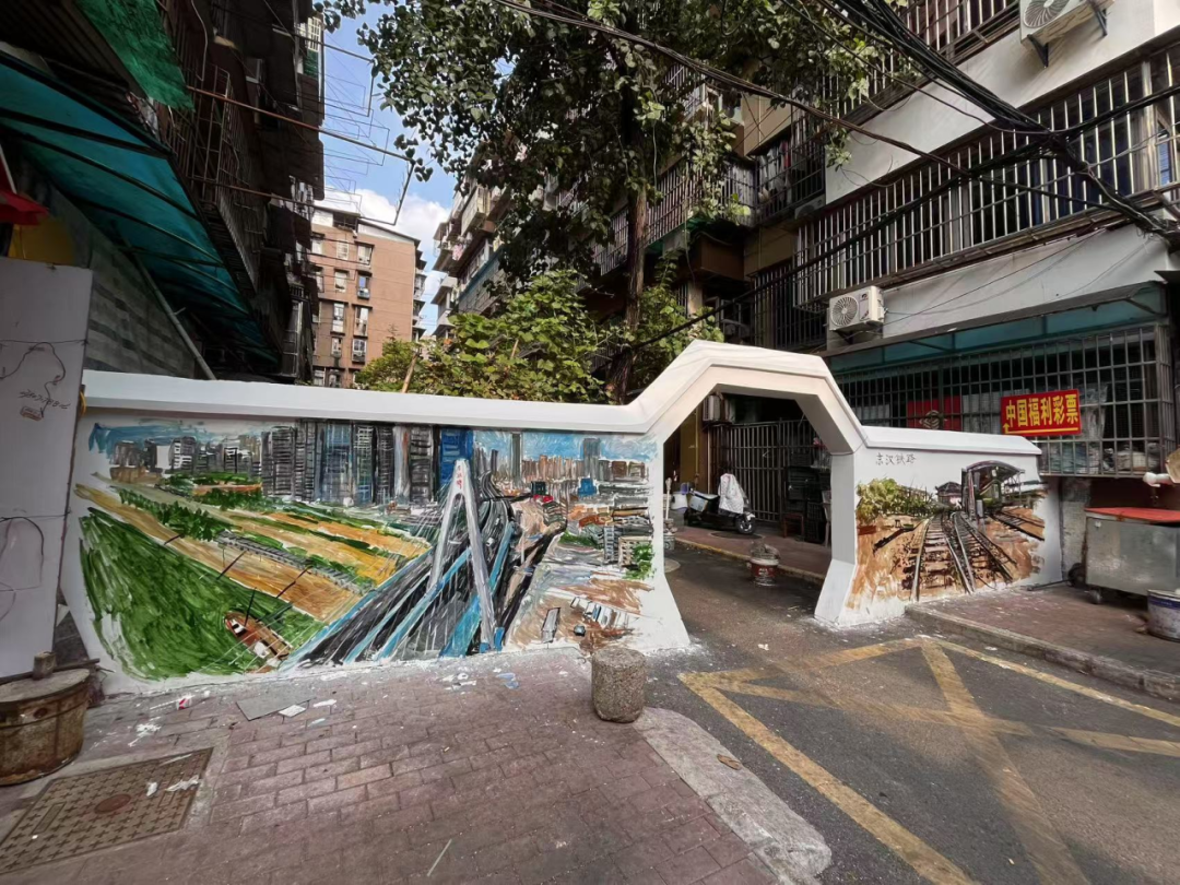 不远处,墙面画风一转,铺开了硚口的时代剪影。月湖桥的轮廓在蓝天下舒展,桥身的现代线条与远处的天际线相映;京汉铁路的铁轨延伸向远方,玉带门车站的老站牌静静伫立,一旁的和谐号列车则带着速度感呼啸而过,新旧交通印记各自成章,却共同诉说着这片土地的发展轨迹。曾经的硚口商场早已淡出视野,如今的原址上是一片开阔的社区绿地,青草与乔木错落,成为居民休闲的新去处。