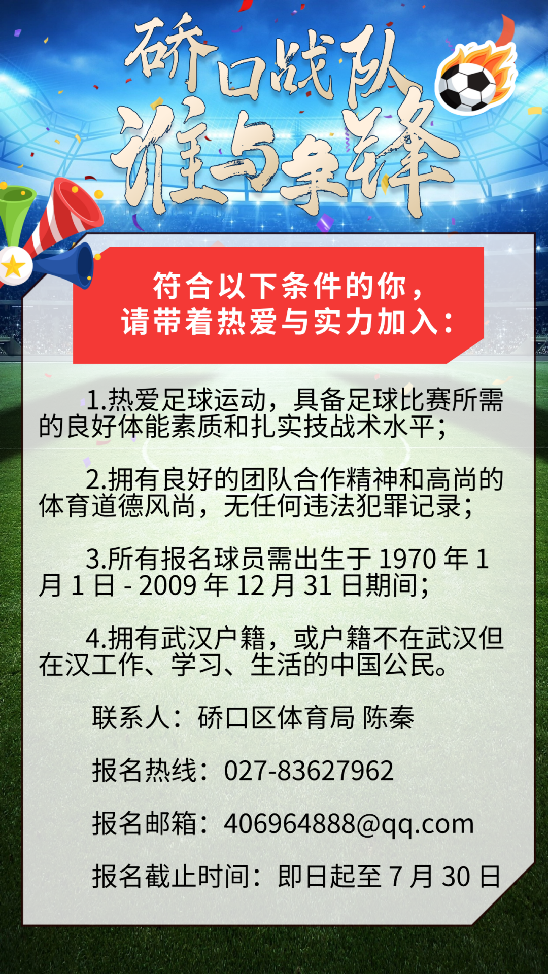 此刻,为组建硚口区最强战队征战汉超,我们向全城发出热血招募令!
