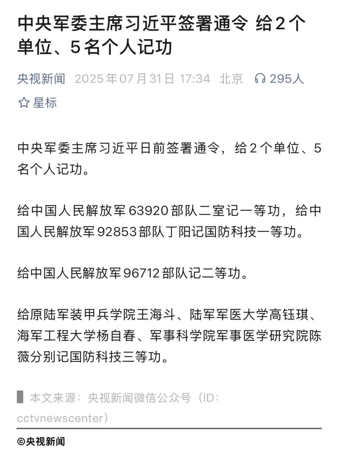 7月31日,新华社发布消息,中央军委主席习近平日前签署通令,给2个单位、5名个人记功。海军工程大学教授杨自春被记国防科技三等功。