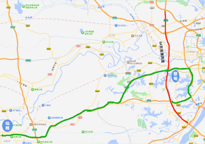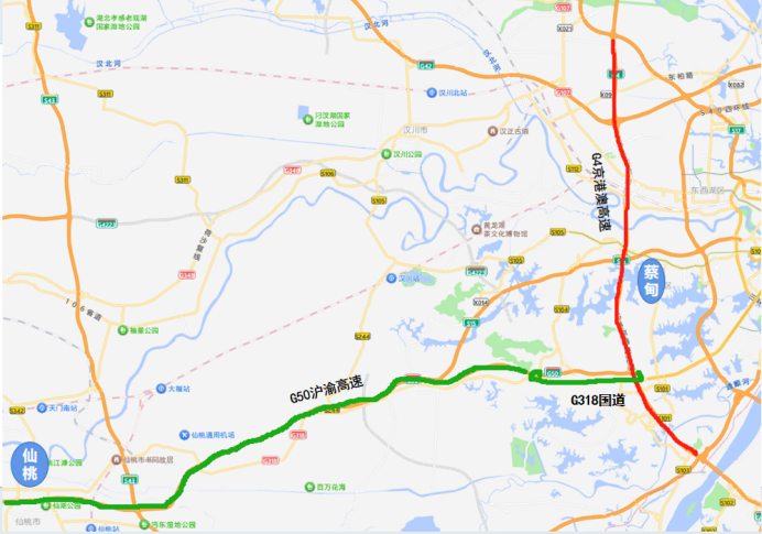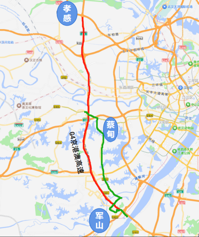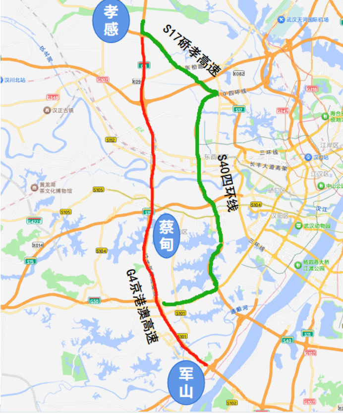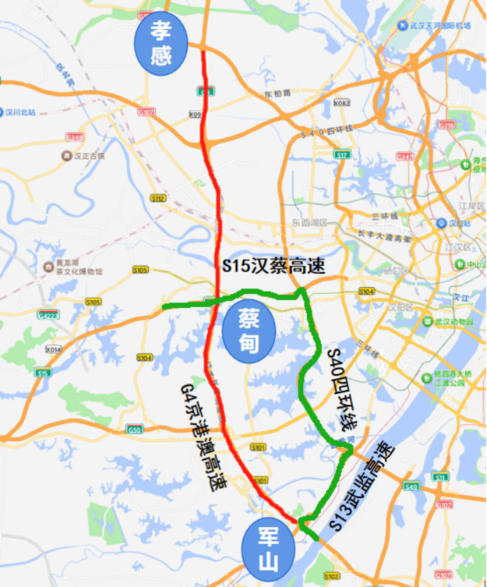 绕行路线一:G4京港澳高速→出蔡甸东收费站→蔡甸(新)收费站→S15汉蔡高速→S40四环线→S13武监高速→G4京港澳高速。