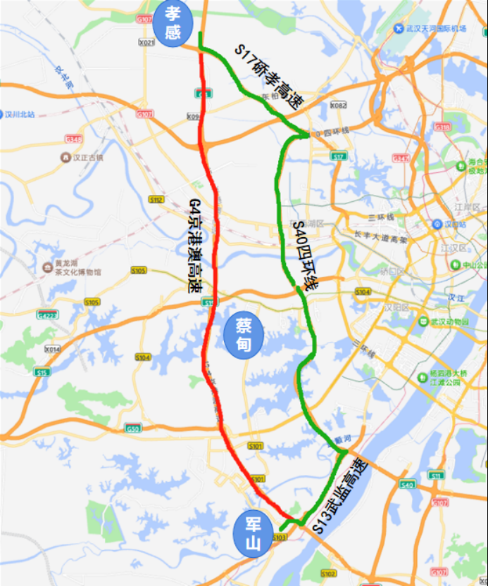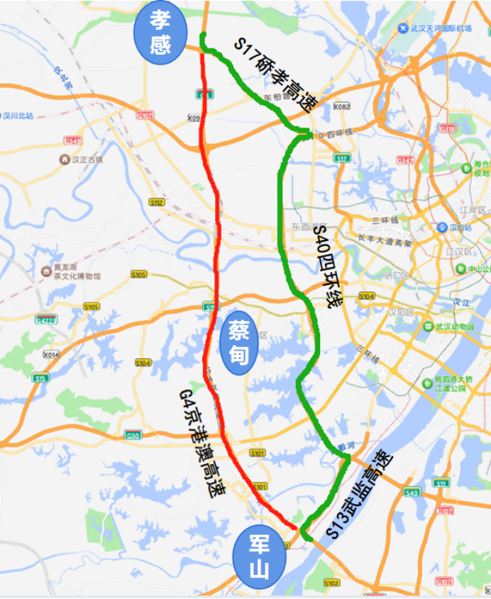 绕行路线:G4京港澳高速→S17硚孝高速→S40四环线→S13武监高速→G4京港澳高速
