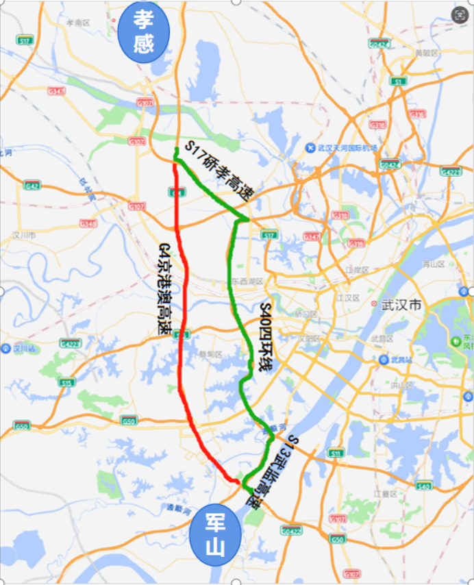 绕行路线:G4京港澳高速→S13武监高速→S40四环线→S17硚孝高速→G4京港澳高速