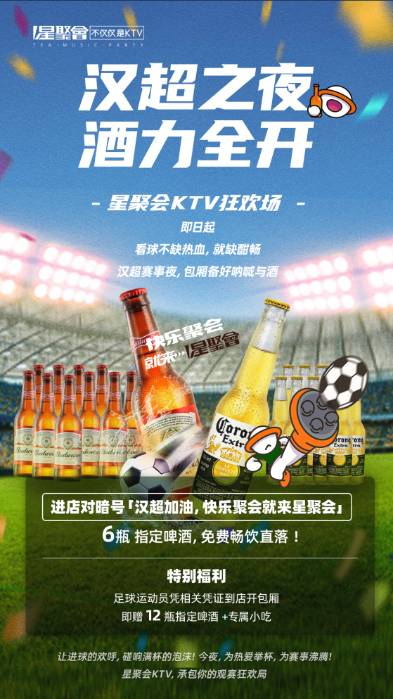 8月25日至9月14日,星聚会(荟聚店)推出“汉超之夜,酒力全开”狂欢场,解决“看球不缺热血,就缺酣畅”的遗憾!进店对暗号“汉超加油,快乐聚会就来星聚会”,免费畅饮6瓶指定啤酒,让观赛的激情与酒香一同蔓延!