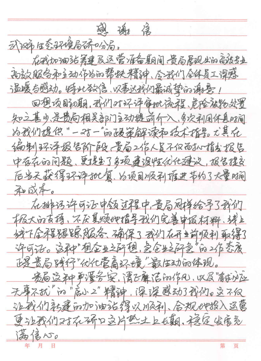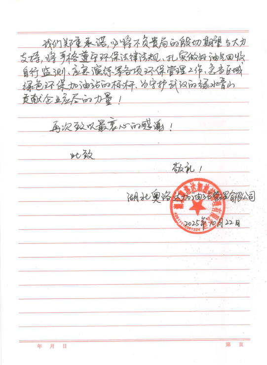 奥洛达公司在感谢信中表示,硚口区分局严谨务实的工作作风、清廉高效的服务精神,以及“有求必应、无事不扰”的服务理念,令他们深受感动。这不仅保障了加油站的顺利落地,更坚定了企业在硚口区长期发展的信心。企业承诺,将严格遵守环保法律法规,全面落实油气回收、自行监测与应急演练等要求,争当区域绿色环保加油站的标杆。