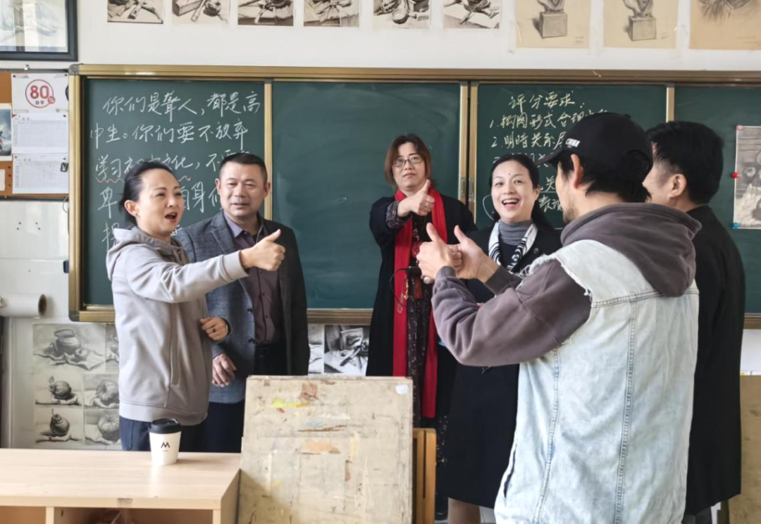 来到教学楼,邰丽华提及当年教过他的老师和1998年来学校工作一年时熟悉的老师时,眼中充满了期待和感激。当我们走到三楼初中组和四楼高中组,她都能一一喊出老师们的名字,并亲切的攀谈。那一刻,让老师们仿佛看到了邰丽华读书时候的样子,还是那么灵动和快乐。沿着教学楼的长廊往前走就是画室,美术组的老师们早早的就等待着她们昔日的同事、同学邰丽华的到来。顿时美术办公室沸腾了起来,美术组的老师都是聋人,她们把刚刚编写完的高中美术校本教程送给了邰丽华,每个人都留下了一段祝福和美好的话语。