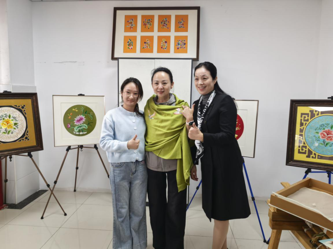 △汉绣班程果老师(原一聋校汉绣班学生)为学姐戴上亲手绣制的汉绣围巾