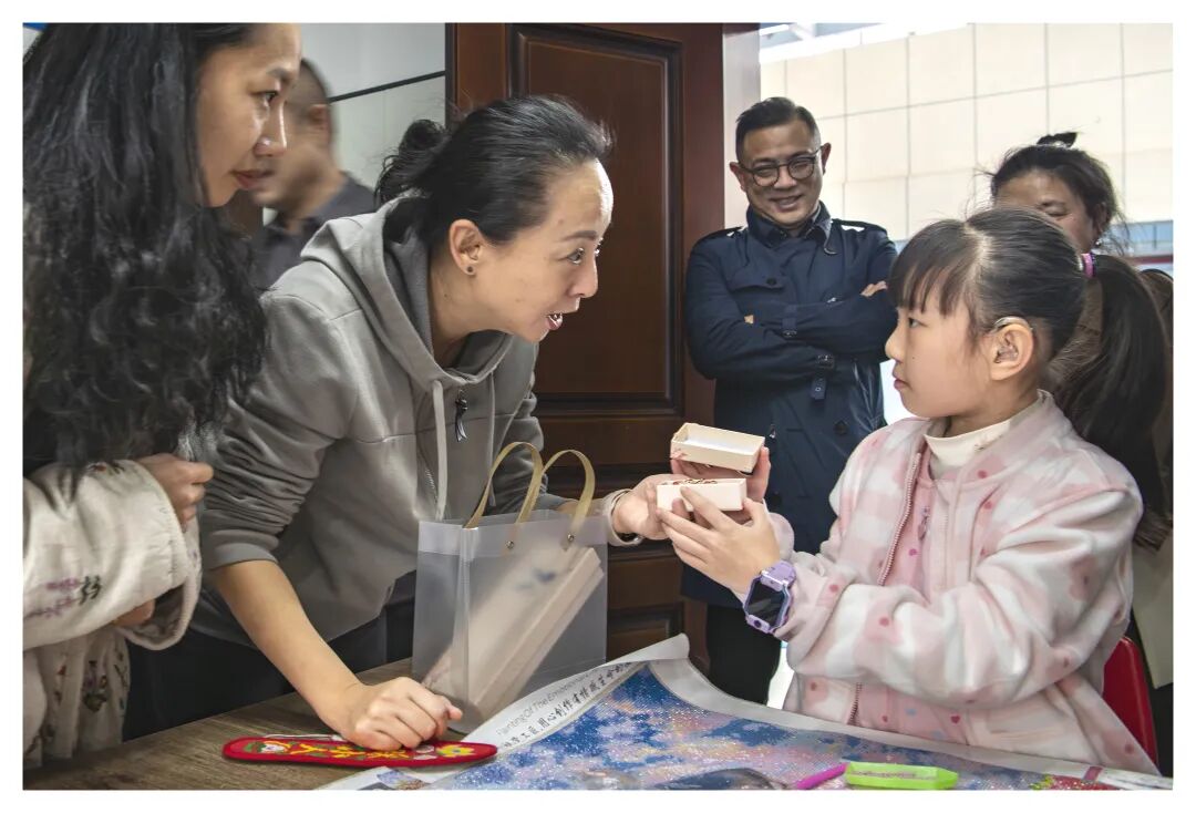 看到一幅幅精美绝伦的作品从这些安静的指尖诞生,她由衷地赞叹学生们“心灵手巧”,并欣慰地表示,在学校能学到如此扎实的一技之长,将为孩子们未来融入社会、实现自我价值奠定坚实的基础。技能班的孩子们个个有绝活,他们还精心地准备了自己的手工、雕花剪纸、书法、汉绣等作品送给亲爱的“邰丽华姐姐”。