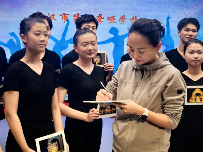邰丽华也把自己精心准备的签有自己名字的千手观音明信片送给在场的全体师生。