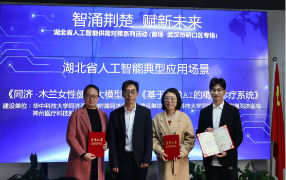 对接会上,硚口区人民政府党组成员黄于恒致辞表示,硚口正抢抓人工智能发展机遇,推动产业智能化转型。湖北省经信厅人工智能和大数据产业处副处长刘婕对产业政策进行深入解读。现场还举行了授牌仪式,同济医院“基于影像AI的精准诊疗系统”和“同济·木兰女性健康大模型”获评“湖北省人工智能典型应用场景”。