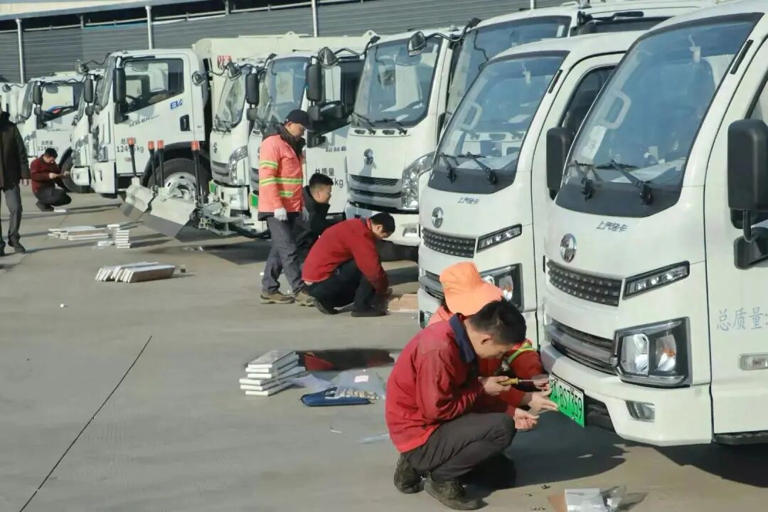 记者在车辆停放现场看到,一台台崭新的高颜值环卫车整齐停放,工人们正在抓紧进行标识涂漆和车牌安装。