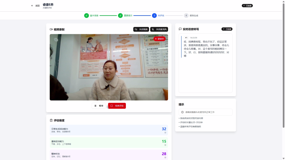 “智慧养老不是空中楼阁,每一步都要踩在政策的节拍上。”睿连康达负责人鲁晓丹表示。公司研发的睿康E养AI辅助评估系统,其从1.0向2.0版本的演进,正是为了更精准地契合相关部门对养老服务标准化、规范化提出的新要求。系统通过技术手段,将复杂的老年人能力评估条款转化为客观、可追溯的数据,辅助提升整个行业的服务精度与效率。