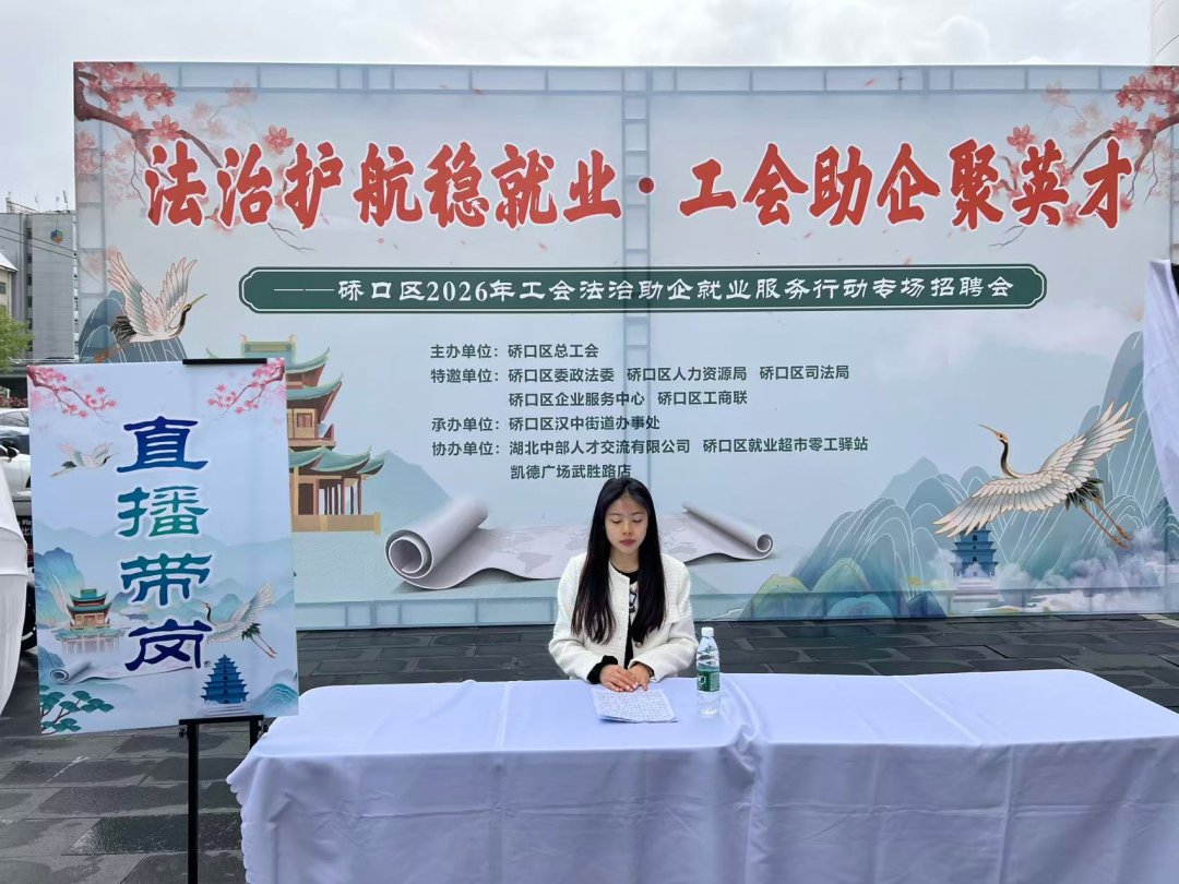 人间四月芳菲尽,法治春风拂面来。4月23日上午,由硚口区总工会主办,特邀硚口区委政法委、区人力资源局、区司法局、区企业服务中心、区工商联指导,汉中街道办事处承办,湖北中部人才交流有限公司、硚口区就业超市零工驿站及凯德广场武胜路店协办的“法治护航稳就业·工会助企聚英才”专场招聘会,在凯德广场(武胜路店)沉浸式启幕。