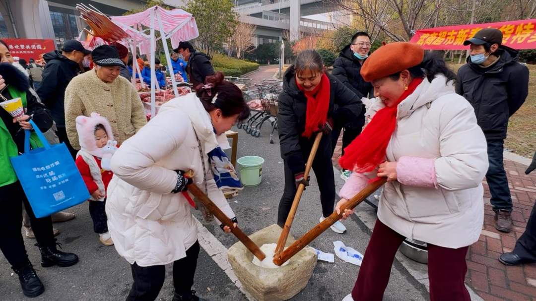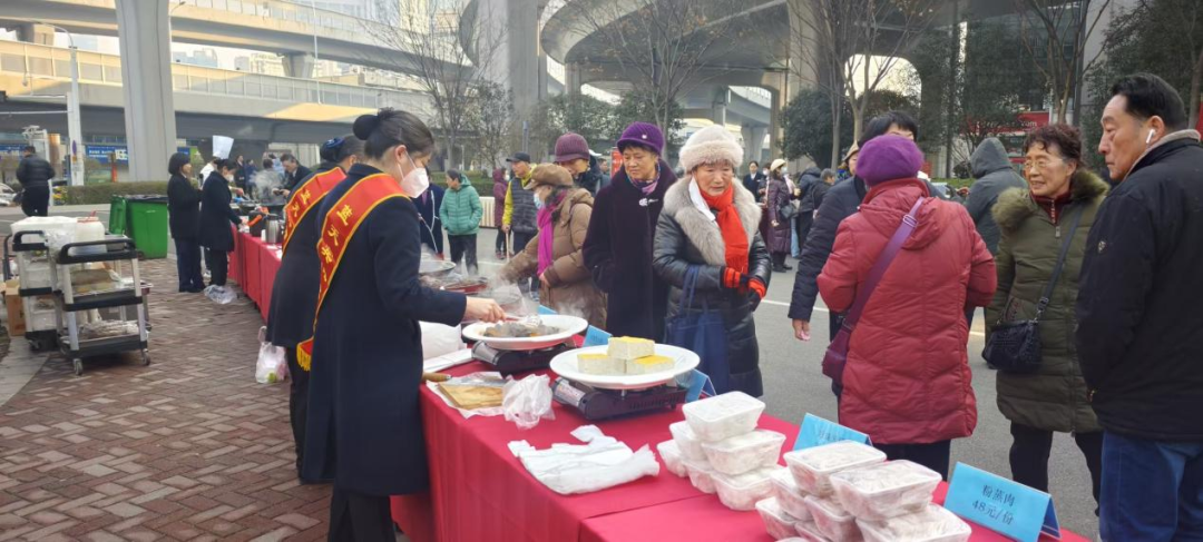 广场两侧的民俗体验区、年货集市区同样热闹非凡。写春联、搋糍粑等传统手艺吸引居民驻足体验;年货区内人来人往,现炸的圆子、藕夹热气腾腾,各色卤味香气扑鼻,大家品鉴美食挑选心仪好物,处处洋溢着温馨祥和的烟火气与人情味。