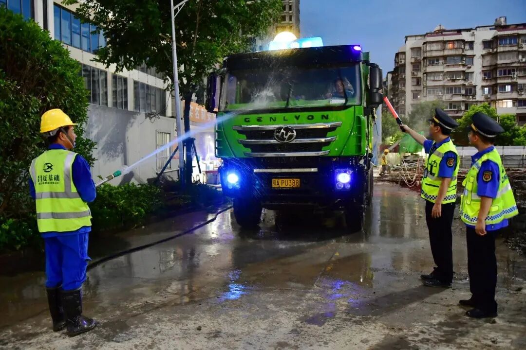 工地出入口位于解放大道这一车水马龙的核心地段,四周酒店商场环抱,作为名副其实的“窗口地带”,面临着渣土清运与路面保洁的双重压力。为此,硚口城管与项目部在议事厅内创新建立起“三个一”保洁机制:组建一支保洁群,邀请城管队员入群监督,路面有污染及时响应、每日晒出保洁成果;安装一套喷淋系统,沿工地四周精准抑制扬尘;配备一辆洒水车,由专职司机每日清晨对工地周边道路进行彻底冲洗降尘。这套机制将保洁标准提升到新的高度,也让工地环境得到持续改善。