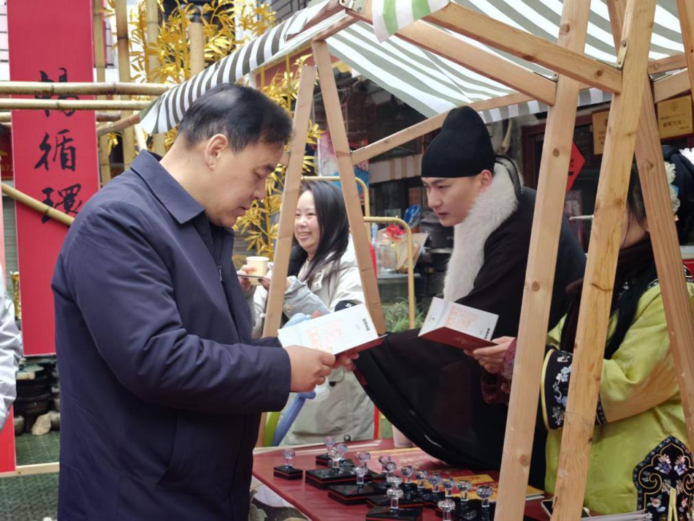 为使精神传承可触可感,活动特别设计了“寻找精神印记”集章打卡环节。四枚精心镌刻的特色印章,分别对应着不同的精神内涵与年俗寓意。参与者手持打卡手册,在参观展览、体验非遗、选购年货的同时完成集章。党员带头参与,群众热情响应,三大精神的“大主题”通过“小游戏”落地生根,在打卡与分享中完成了潜移默化的传递。