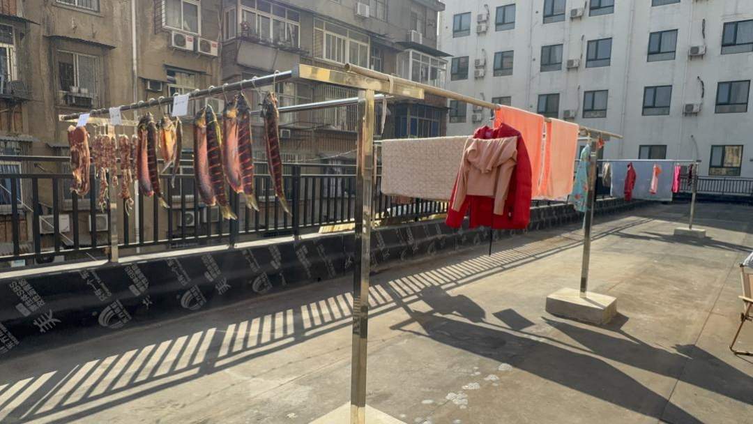 城管人员帮晾晒腌制品的居民“搭把手”