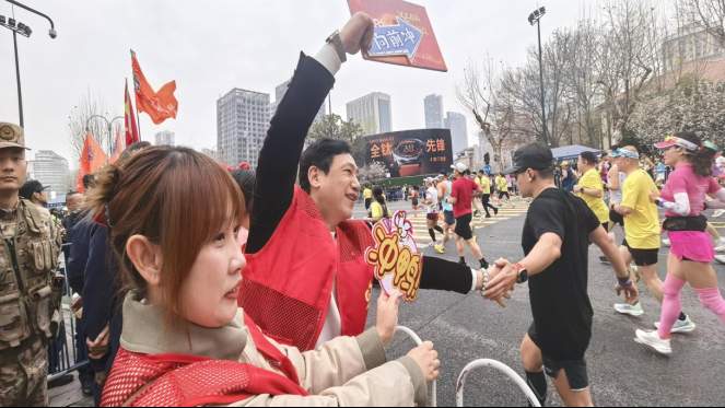 在中山大道、江汉桥下,由街道干部、社区工作者、热心商户组成的“汉正街志愿服务队”,以最饱满的热情喊出“汉正街欢迎你”的口号。他们不仅是秩序的维护者,更是城市温度的传递者。补给站前,递水送药、微笑鼓劲;路口节点,耐心引导、细心提醒。一抹抹跃动的志愿红,成为赛道旁最温暖的底色,让跑者在全力冲刺之余,也能感受到来自汉正街的贴心守护。