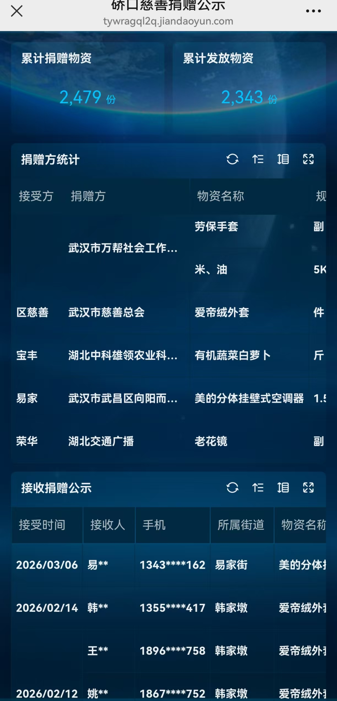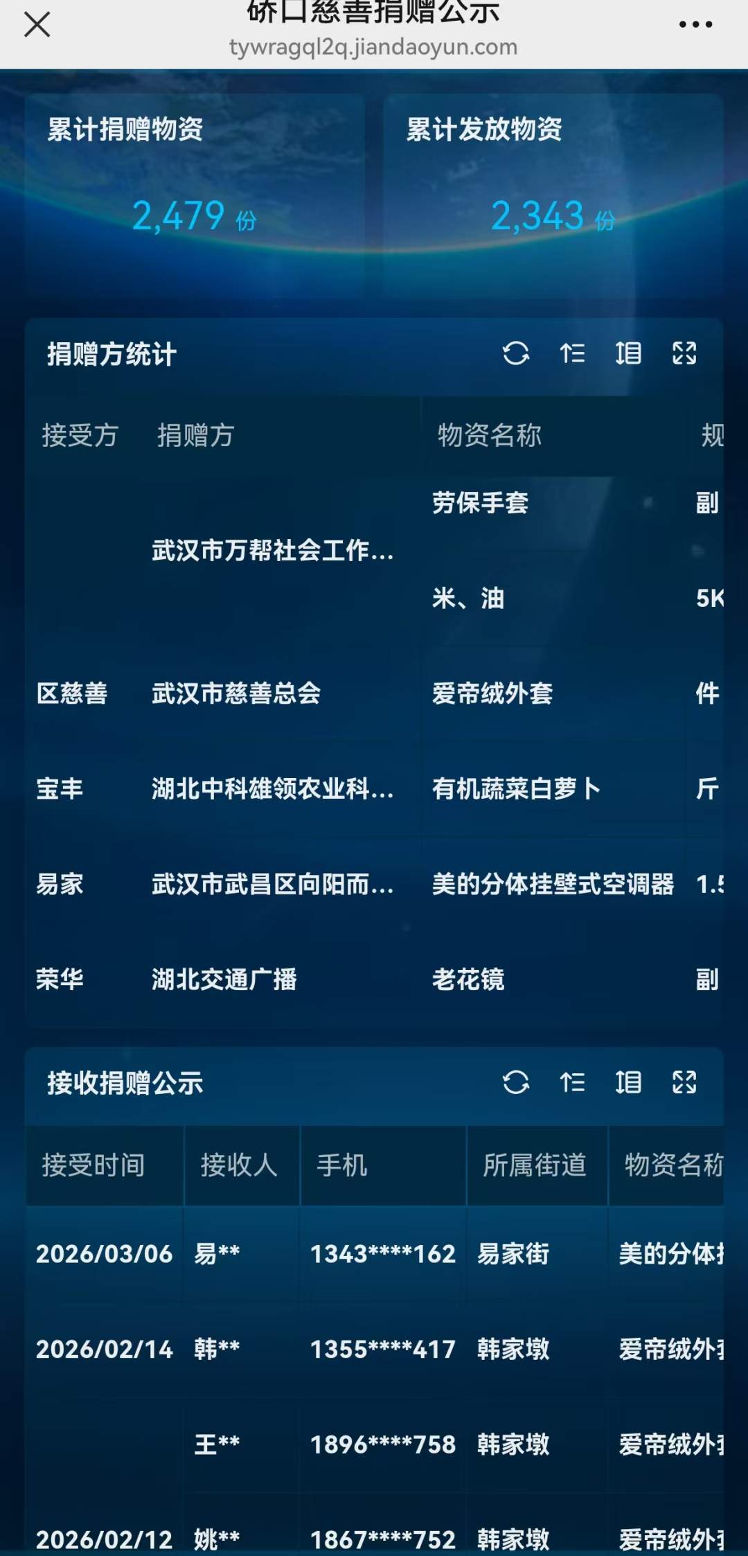一是捐赠登记:爱心物资收到后,手机一键录入,信息实时同步;