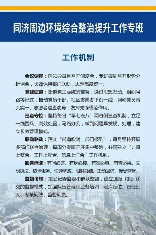 纵向贯通,高位统筹,“三个一”治理新模式让“小马也拉得动大车”。领导重视、组织保障。在区领导的统筹下,成立了由宝丰街道、城管执法局主要负责人为双组长,民政、卫健、市监、公安、交管、环卫、同济等7个部门单位为成员的整治工作专班,构建了2+7工作格局,形成了齐抓共管的工作局面;制定方案、明确责任。制发了《同济医院周边环境综合整治提升工作方案》,细化了单车管理、环境卫生、机动车停放秩序、食品安全等10个方面的工作标准和责任人,以问题清单和责任清单倒逼各项工作任务逐项落实;创新机制、强化调度。工作整治专班实行“日清零、周整治、月调度”马路办公机制,先后8次召集相关单位召开工作会议。挂点区领导、分管区领导、各责任部门负责人深入整治一线,现场发现、协调解决问题、督导工作落实,实现了“小问题不过夜、大问题不隔天”的工作标准。