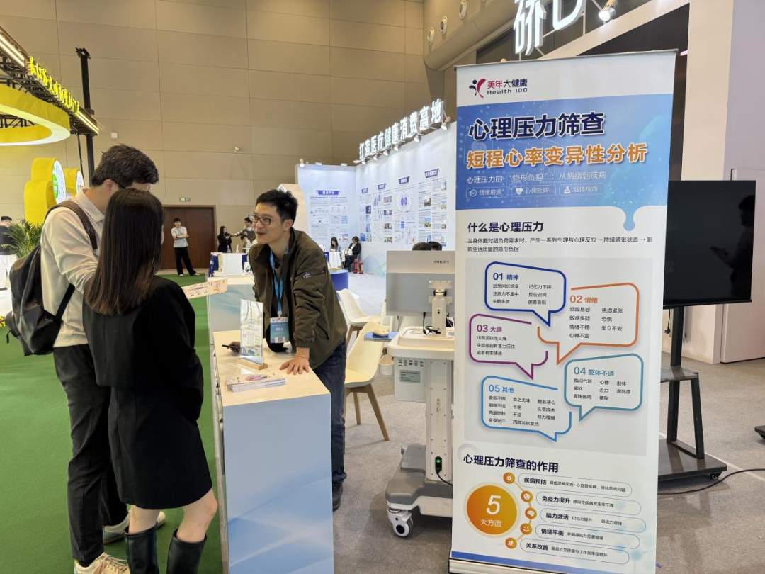 美年大健康则展出最新研发的精神压力评估仪:设备仅通过短时程ECG信号采集,即可快速预测人体健康状态,评估自主神经功能,直观呈现身体与精神压力水平,为亚健康筛查提供高效、便捷的新路径。